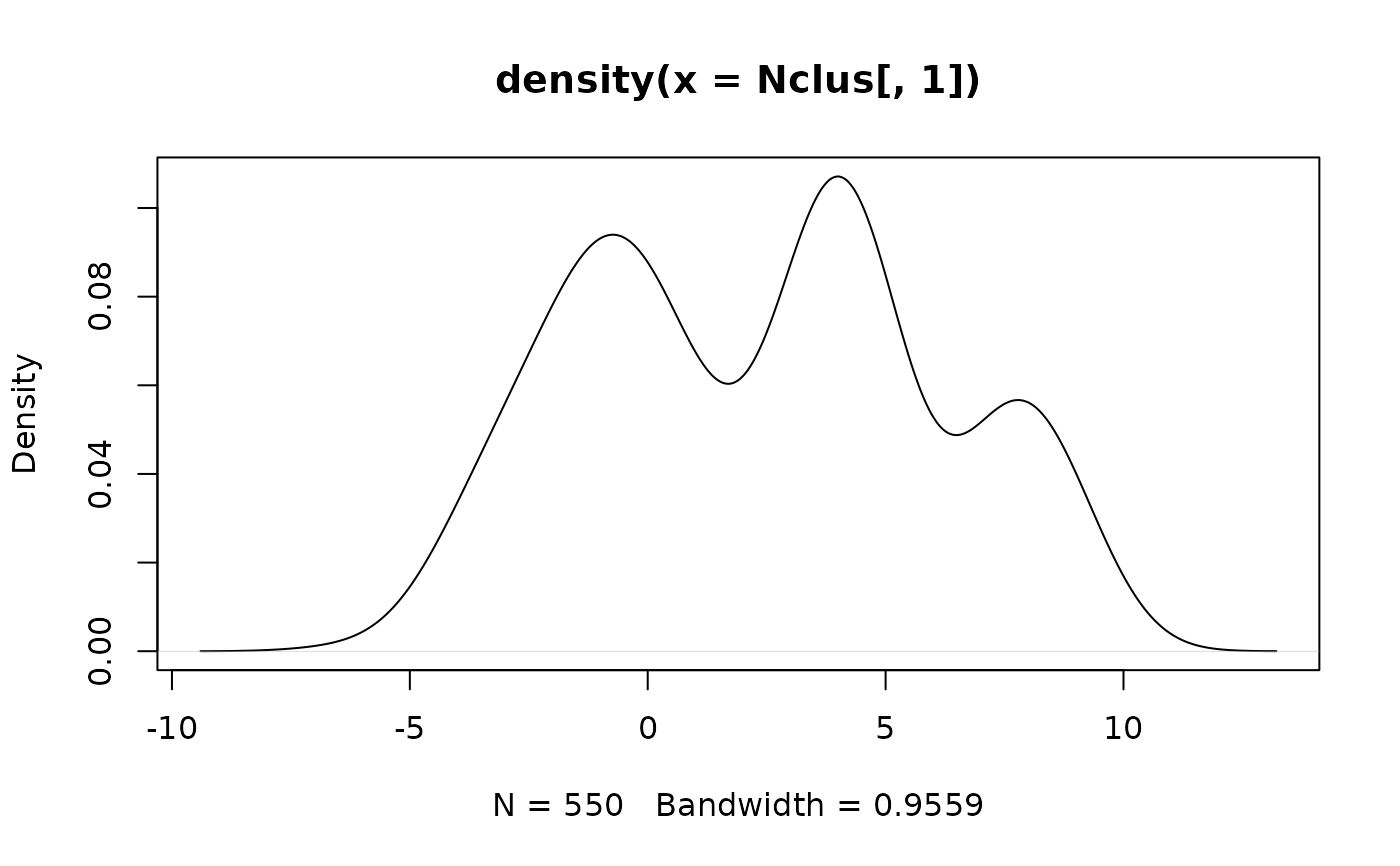 #> flexmix(formula = Nclus[, 1] ~ 1, cluster = cut(Nclus[, 1], 3),