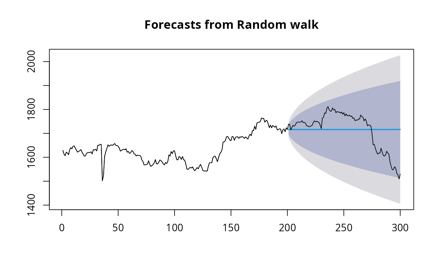 fit1 <- rwf(EuStockMarkets[1:200, 1], h = 100)