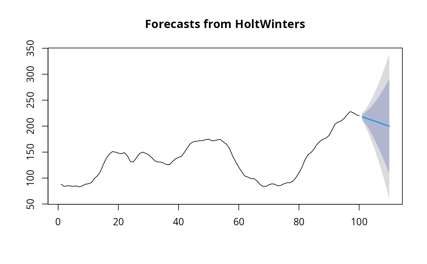 HoltWinters. Usually the result of a call tostats::HoltWinters().- h