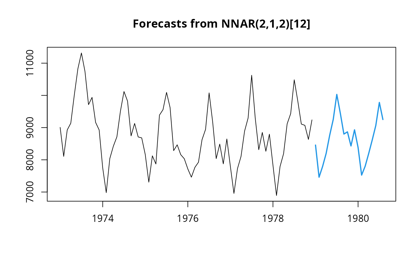 Prediction intervals are calculated through simulations and can be slow. Note that if the network is too complex and overfits the data, the residuals can be arbitrarily small; if used for prediction interval calculations, they could lead to misleadingly small values. It is possible to use out-of-sample residuals to ameliorate this, see examples.