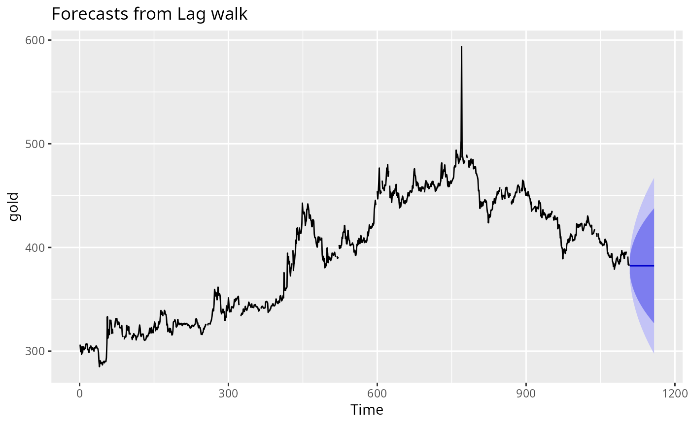 lag = 1corresponds to a standard random walk (giving naive forecasts ifdrift = FALSEor drift forecasts ifdrift = TRUE), whilelag = mcorresponds to a seasonal random walk where m is the seasonal period (giving seasonal naive forecasts ifdrift = FALSE).- x
