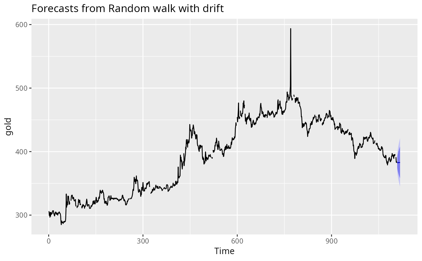 rwf(gold, drift = TRUE) |> autoplot()