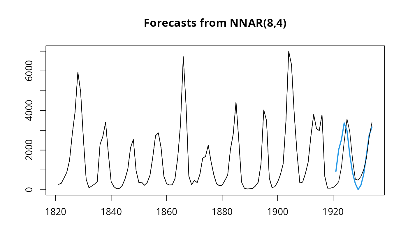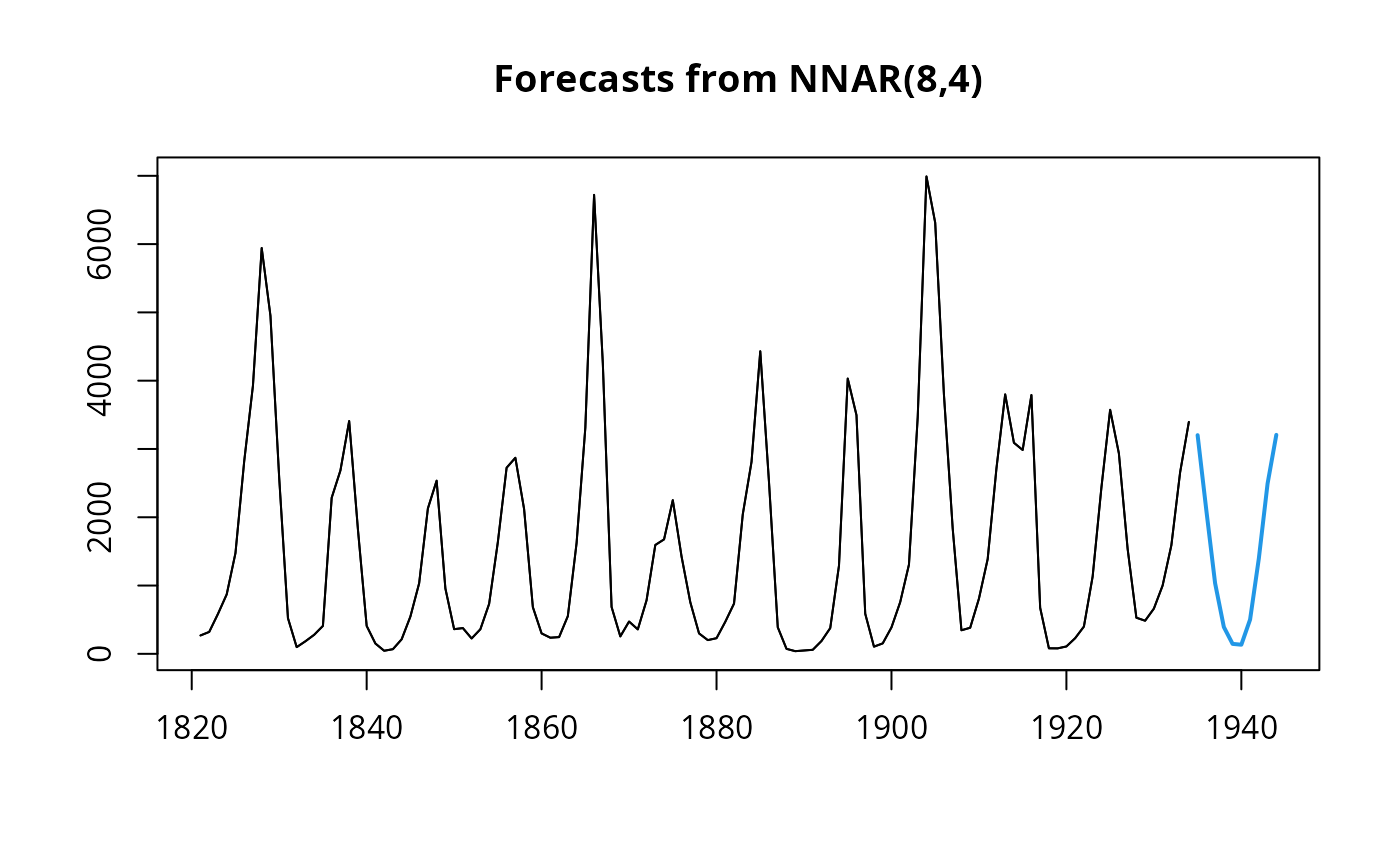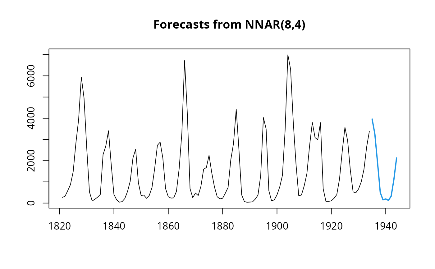 fit <- nnetar(window(lynx, end = 1920), decay = 0.5, maxit = 150)