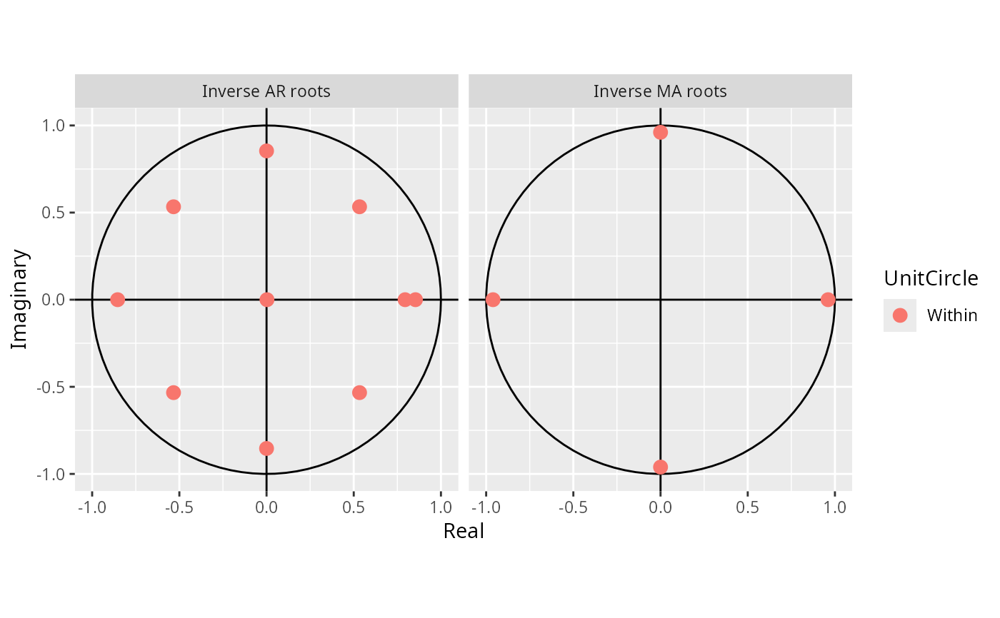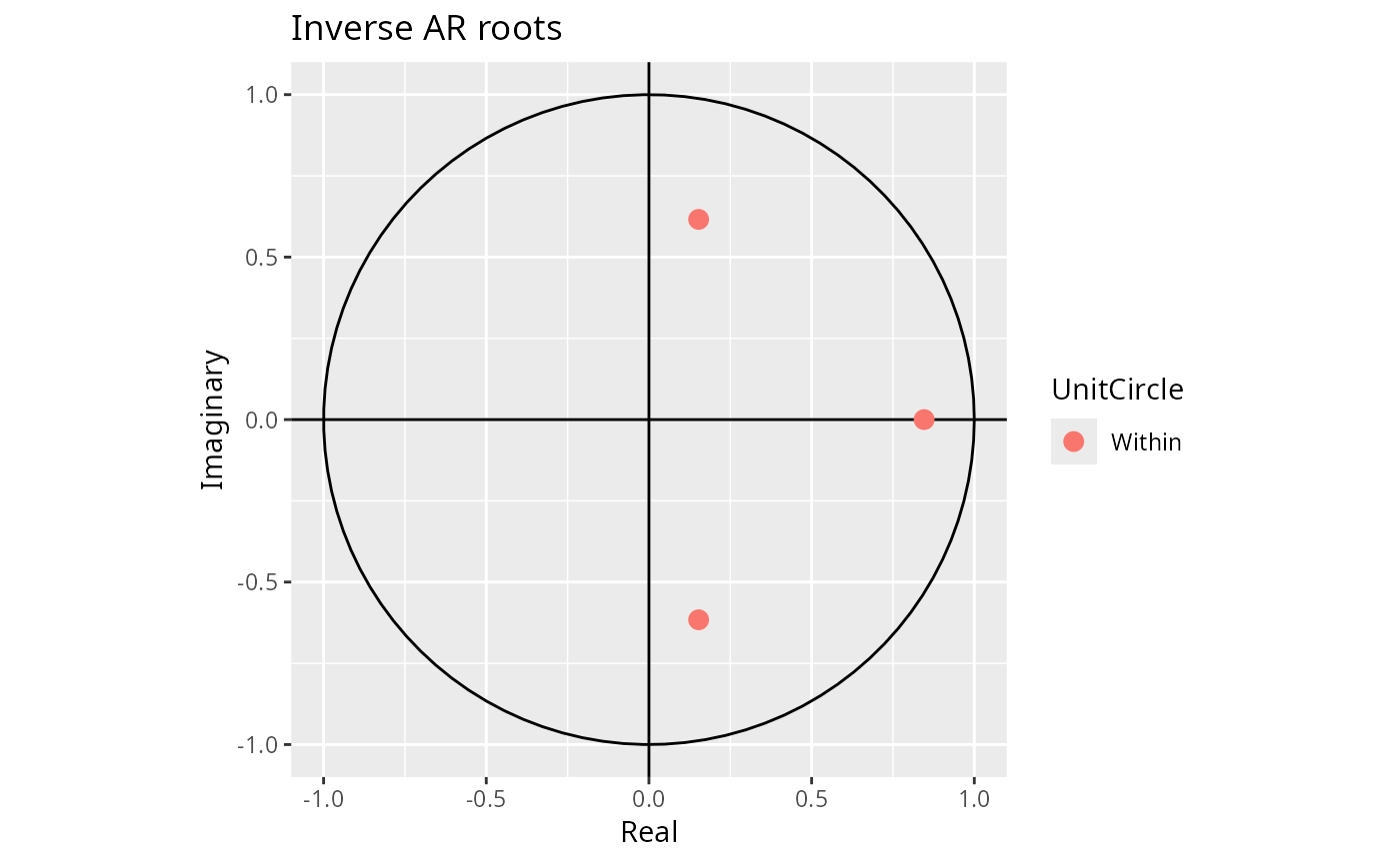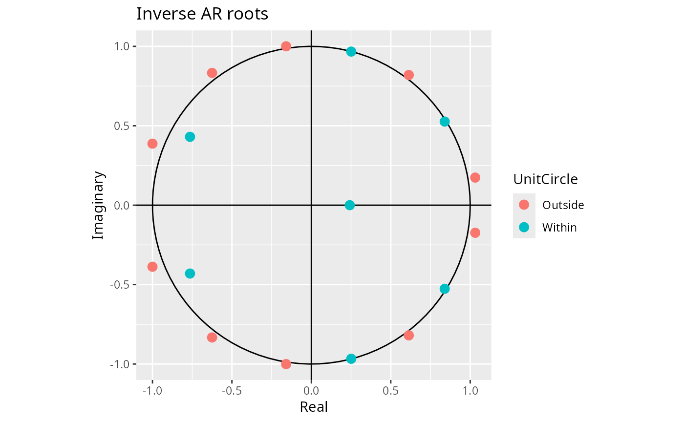 Produces a plot of the inverse AR and MA roots of an ARIMA model. Inverse roots outside the unit circle are shown in red.