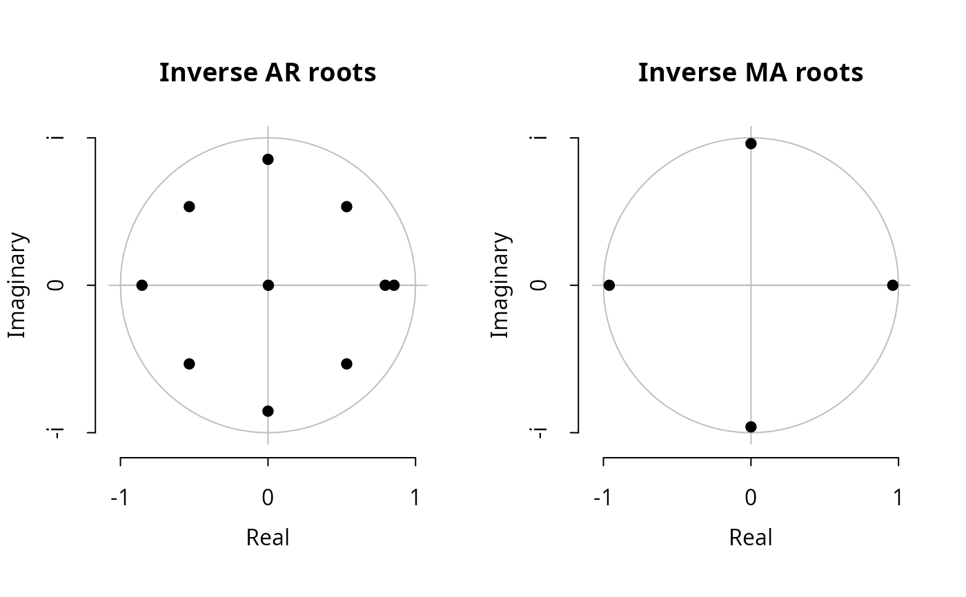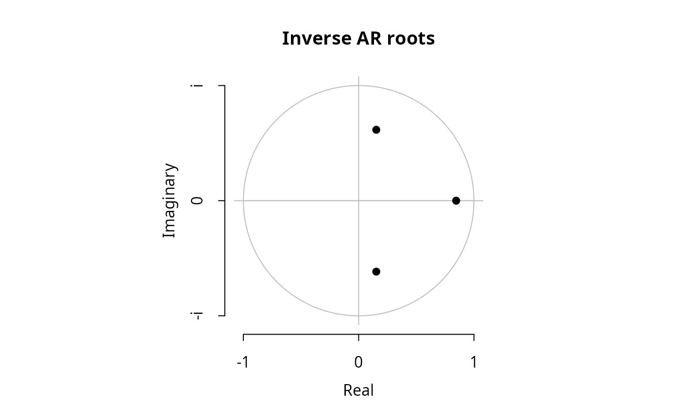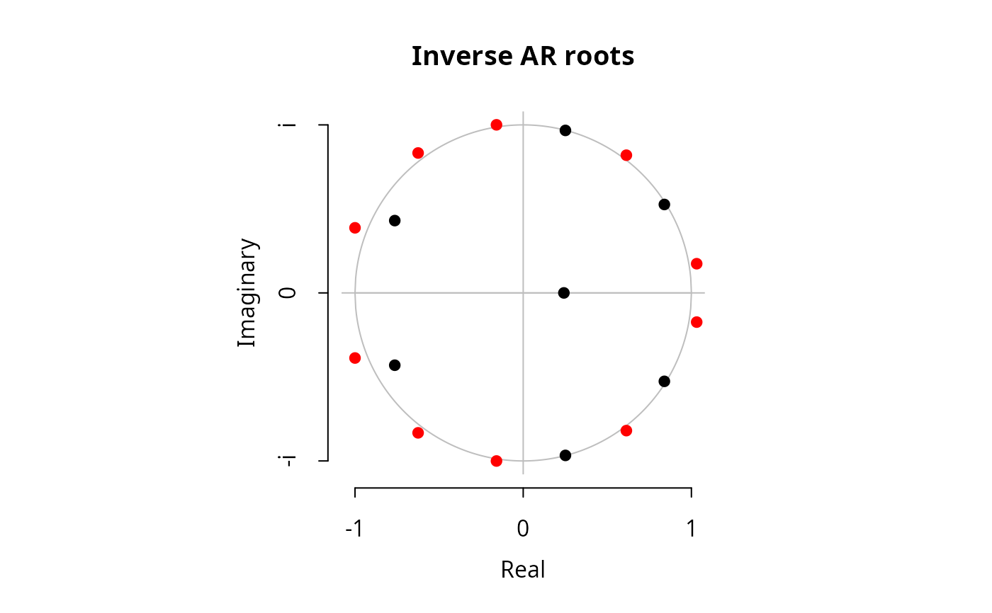 Produces a plot of the inverse AR and MA roots of an ARIMA model. Inverse roots outside the unit circle are shown in red.