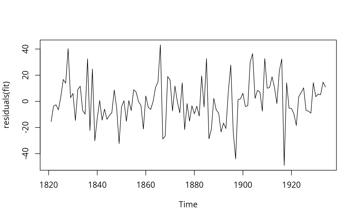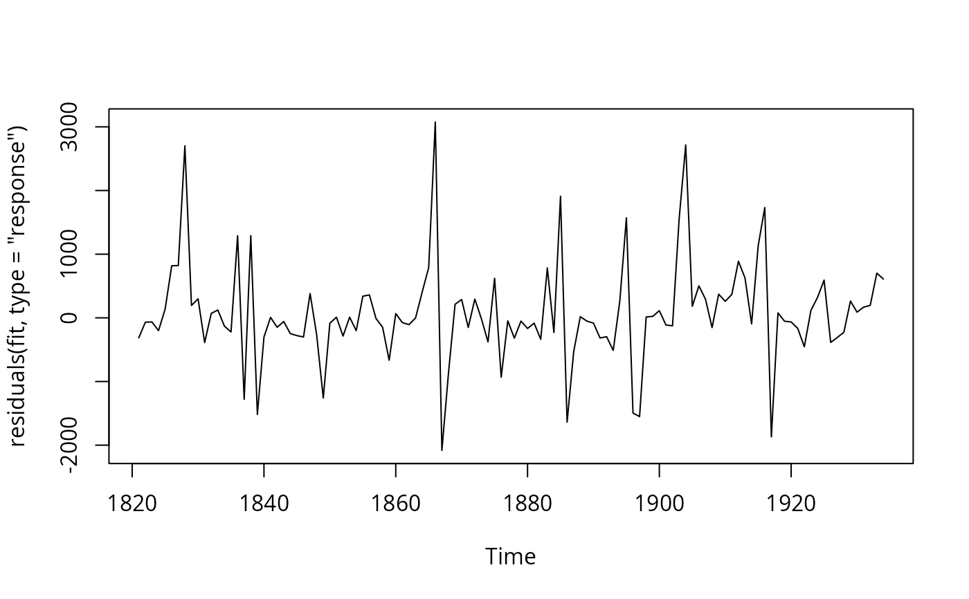 innovationresiduals are estimates of the innovations in the model; these should look like white noise for a well-fitted model. Theresponseresiduals are equal to the observation minus its fitted value. For many models,innovationandresponseresiduals will be identical, but not if there has been a transformation used, or for an ETS model with multiplicative errors. Aregressionresidual from a dynamic regression model (residuals.Arima) is equal to the response variable minus the linear combination of predictors.- ...