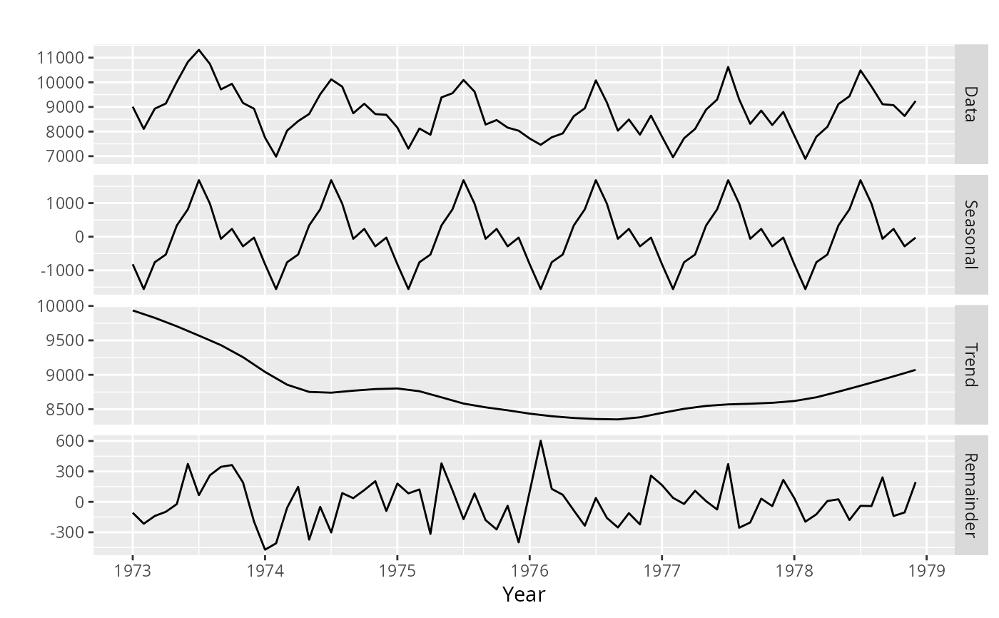 stats::decompose(),stats::stl()ortbats().