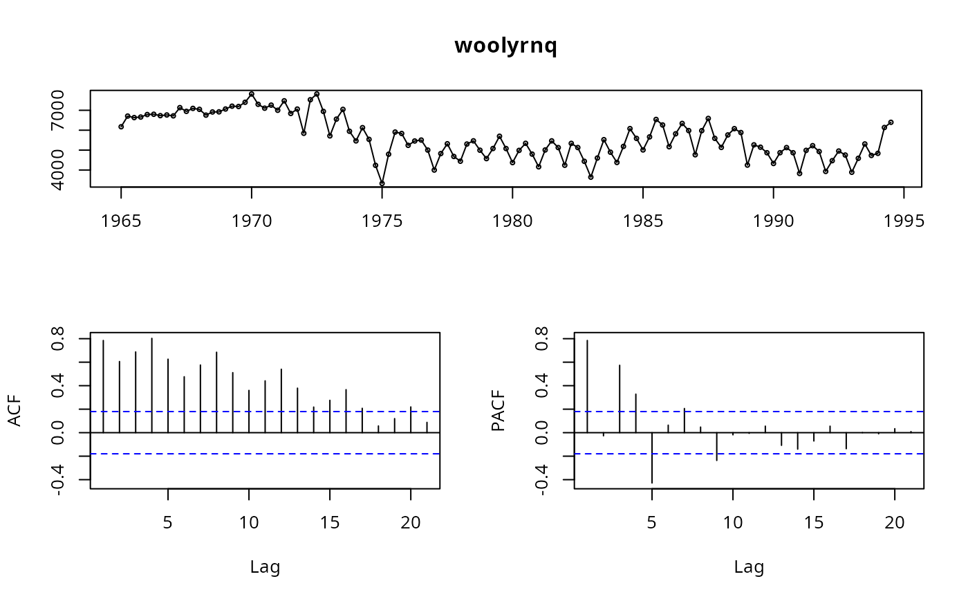 Quarterly production of woollen yarn in Australia: tonnes. Mar 1965 – Sep 1994.