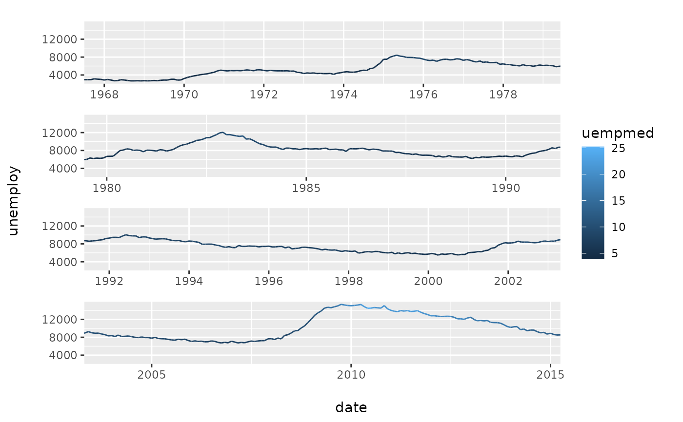 library(ggplot2) library(ggbreak) p <- ggplot(economics, aes(x=date, y = unemploy, colour = uempmed)) + geom_line() p + scale_wrap(n=4)