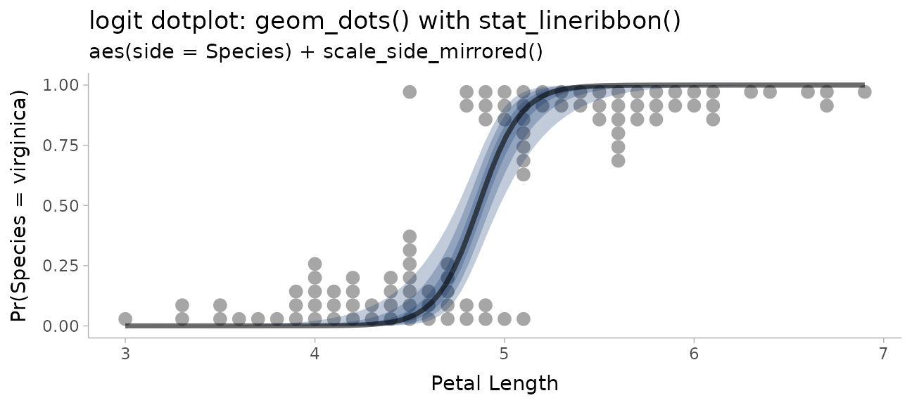 title = "logit dotplot: geom_dots() with stat_lineribbon()",