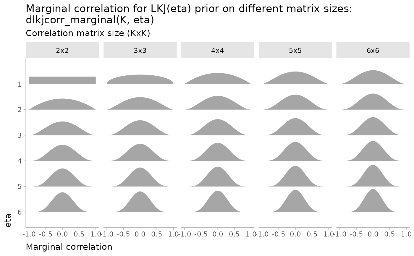 lkjcorr_marginal.RdMarginal distribution for the correlation in a single cell from a correlation matrix distributed according to an LKJ distribution.