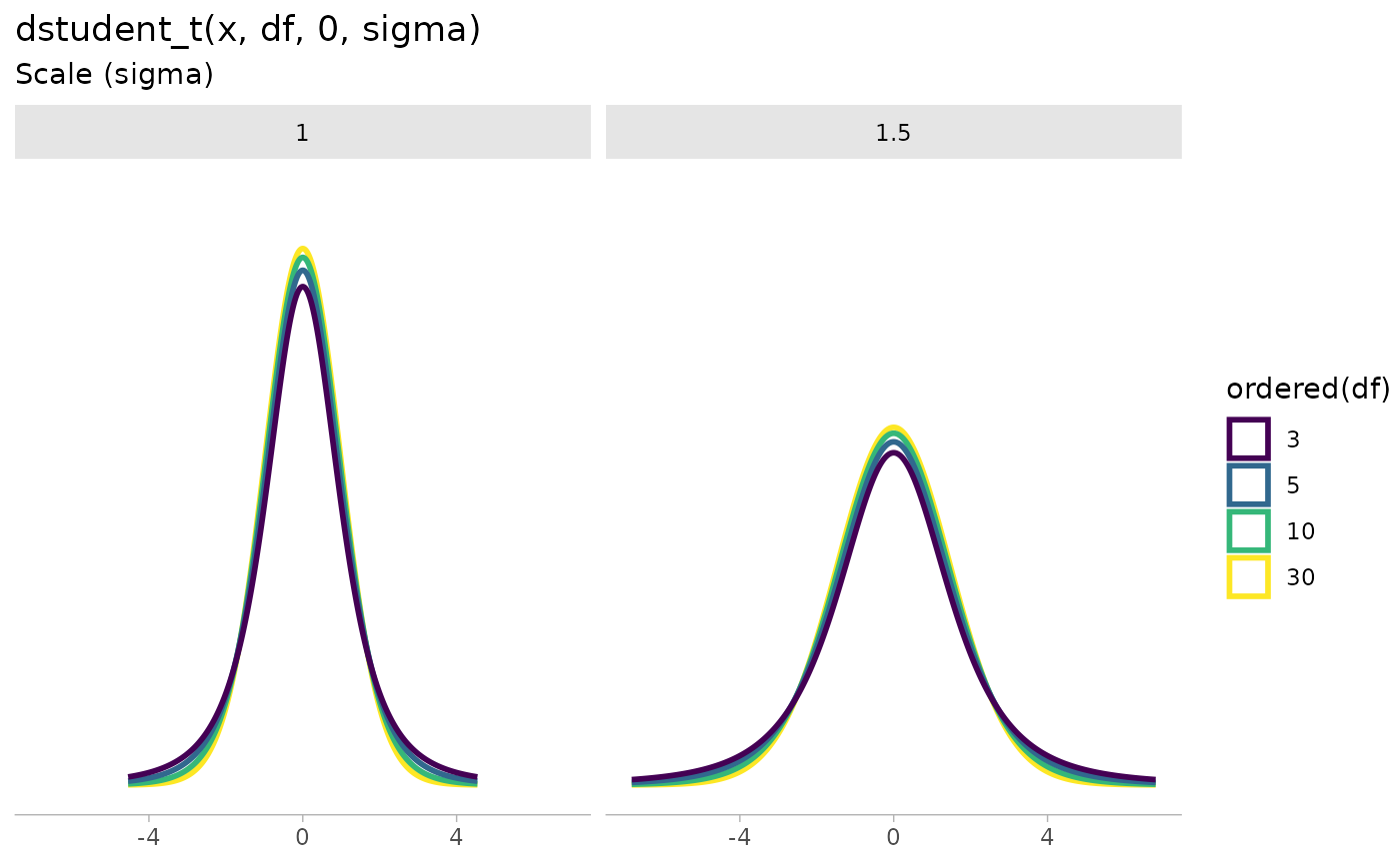 ggplot(aes(y = 0, dist = "student_t", arg1 = df, arg2 = 0, arg3 = scale, color = ordered(df))) +