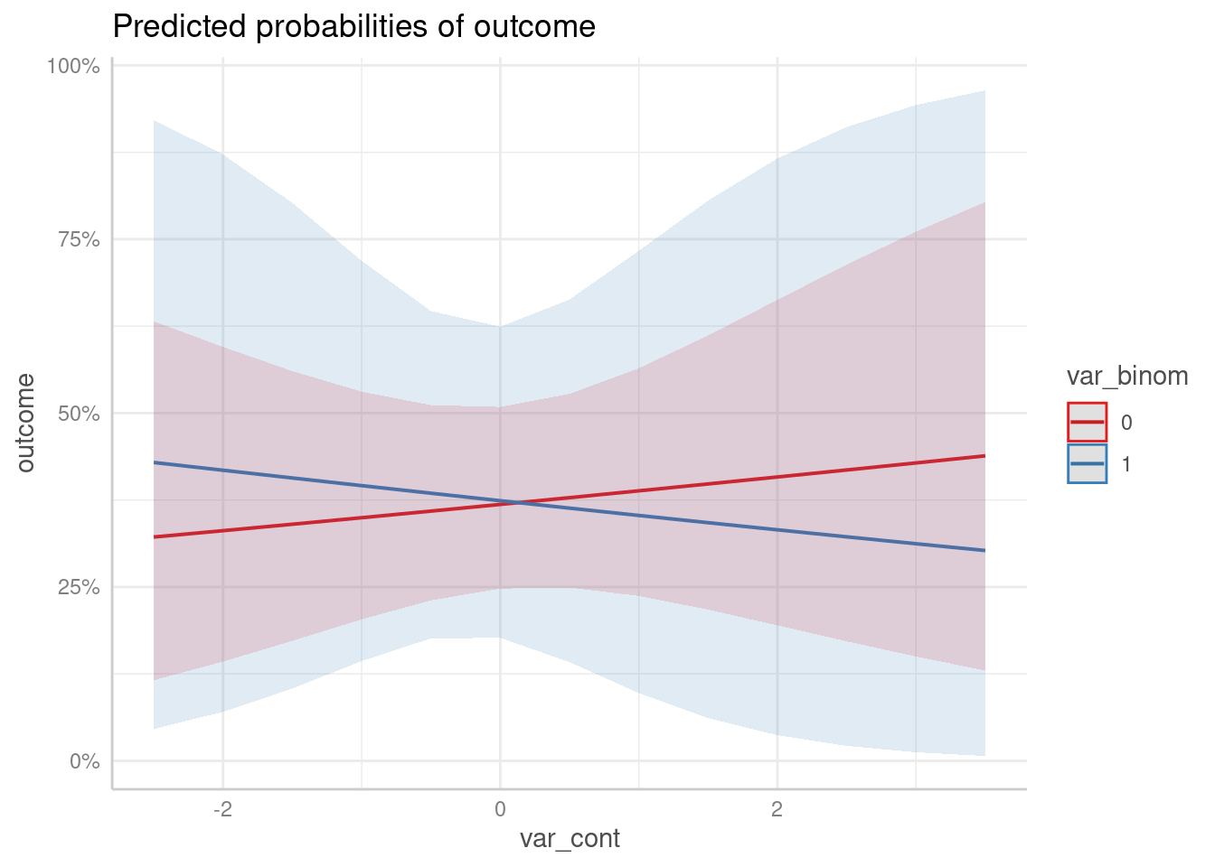 )To compute or plot adjusted predictions of interaction terms, simply specify these terms, i.e. the names of the variables, as character vector in the terms-argument. Since we have an interaction between var_binom and var_cont, the argument would be terms = c("var_binom", "var_cont"). However, the first variable in the terms-argument is used as predictor along the x-axis. Adjusted predictions are then plotted for specific values or at specific levels from the second variable.