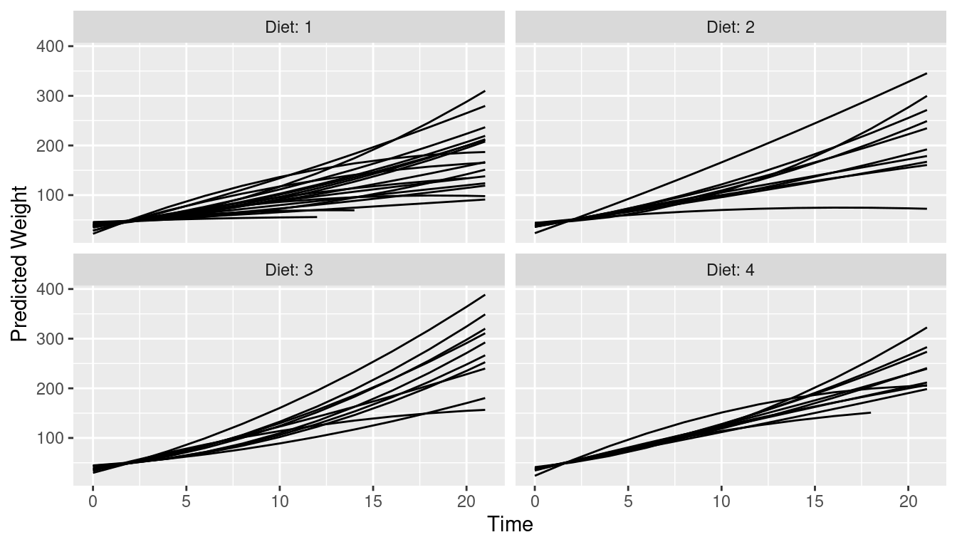 p2 <- ggplot(pred2, aes(Time, estimate, level = Chick)) +