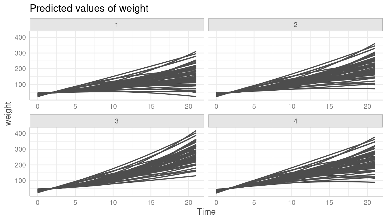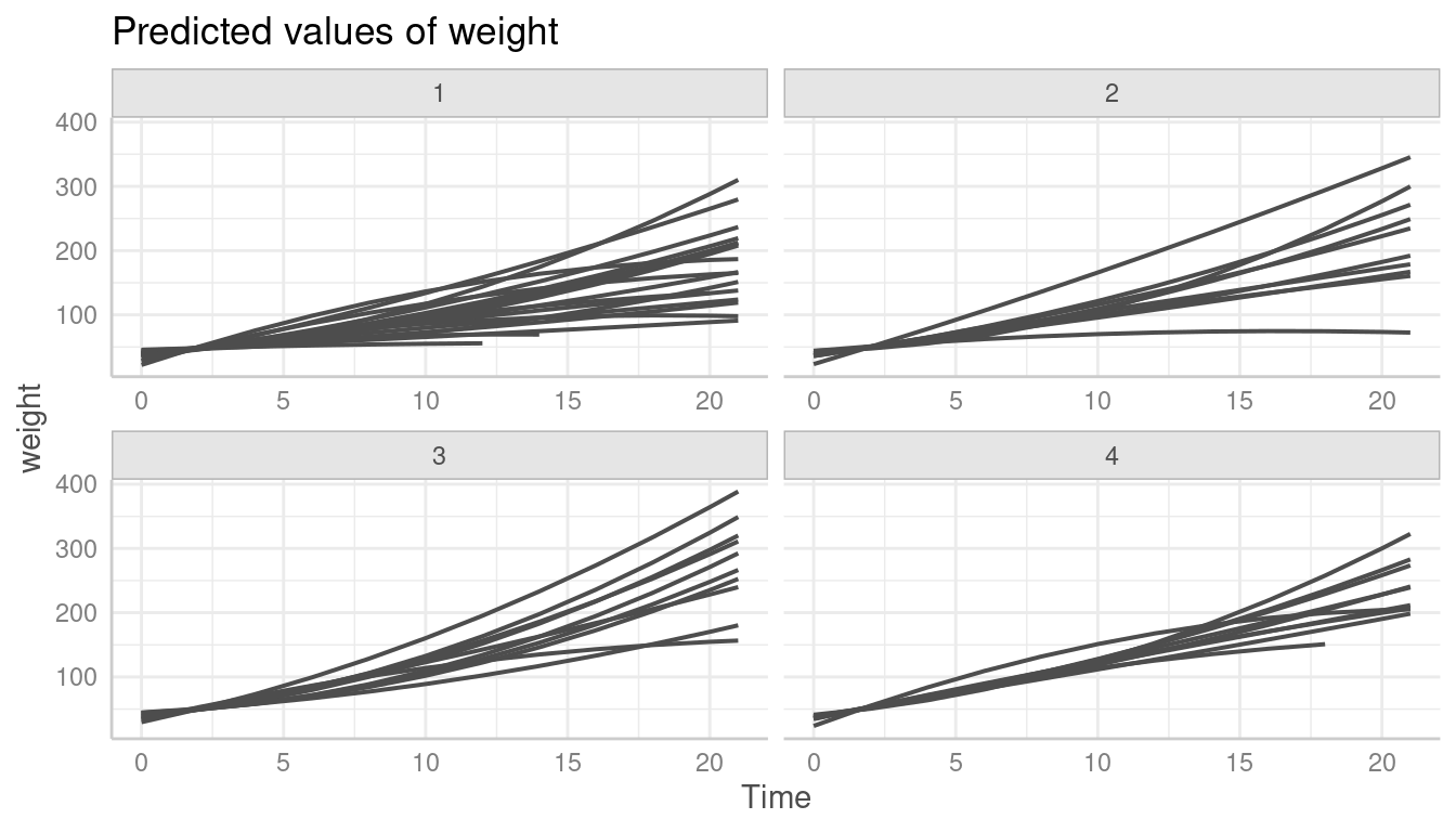 labs(y = "Predicted weight", x = "Time", title = "Linear growth model")
