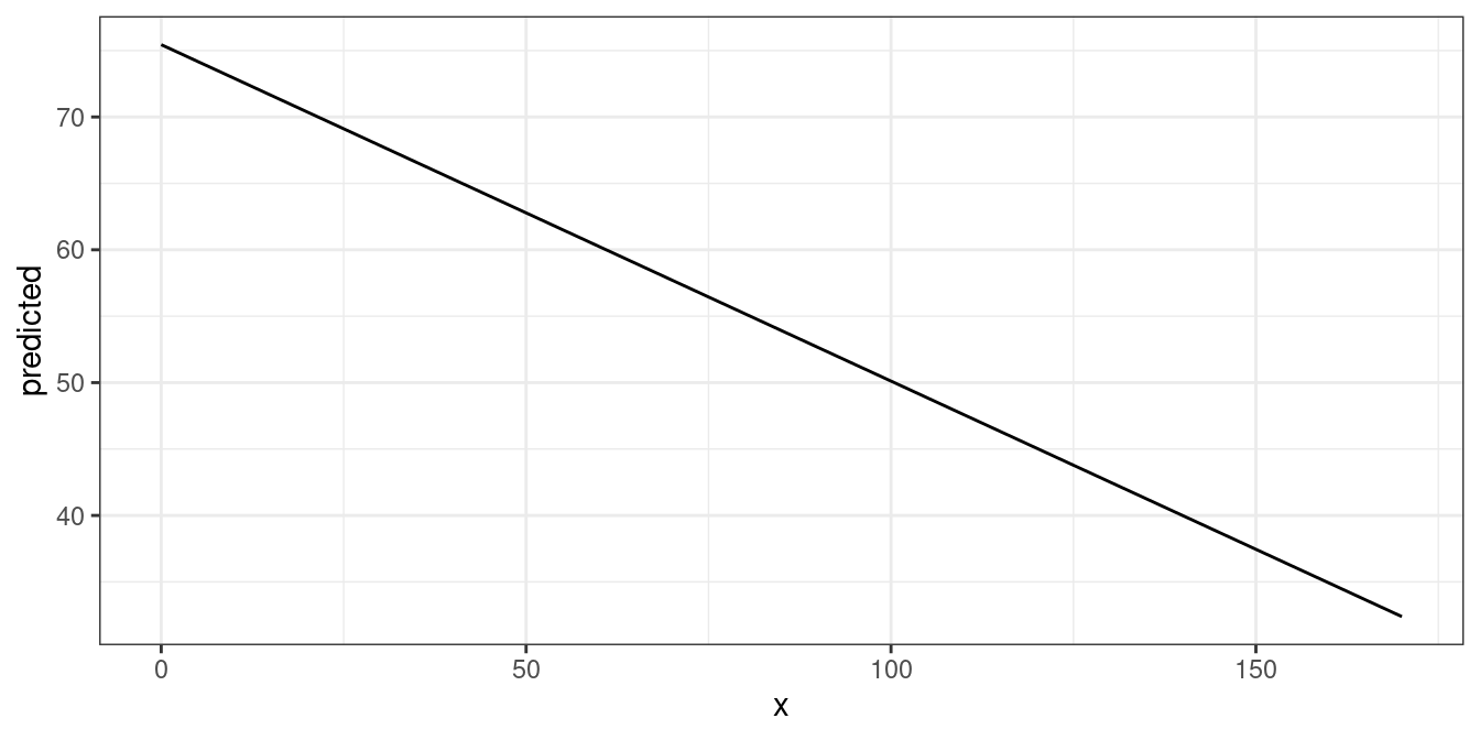 predict_response() computes predicted values for all possible levels and values from model’s predictors that are defined as focal terms. In the simplest case, a fitted model is passed as first argument, and the focal term as second argument. Use the raw name of the variable for the terms-argument only - you don’t need to write things like poly(term, 3) or I(term^2) for the terms-argument.