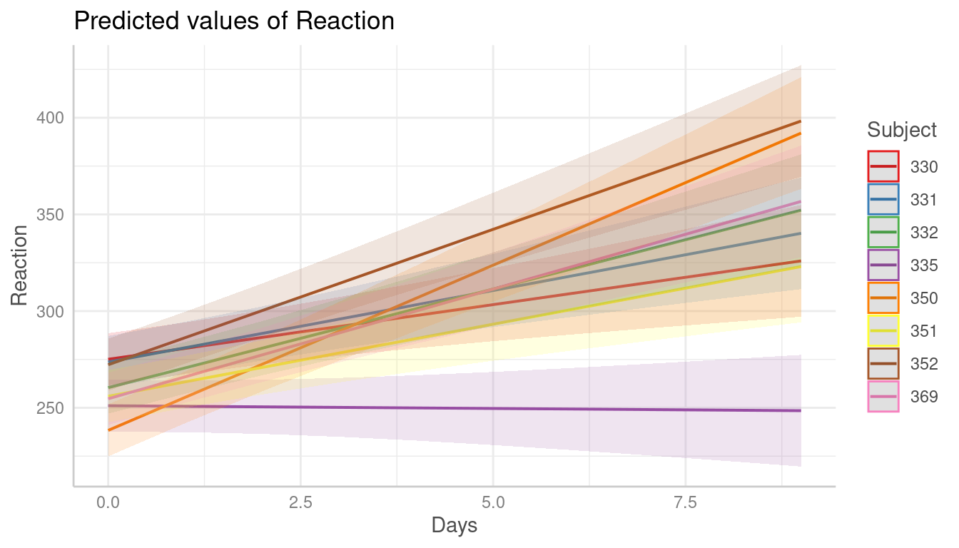 me <- predict_response(m, terms = c("Days", "Subject [sample=8]"), type = "random")