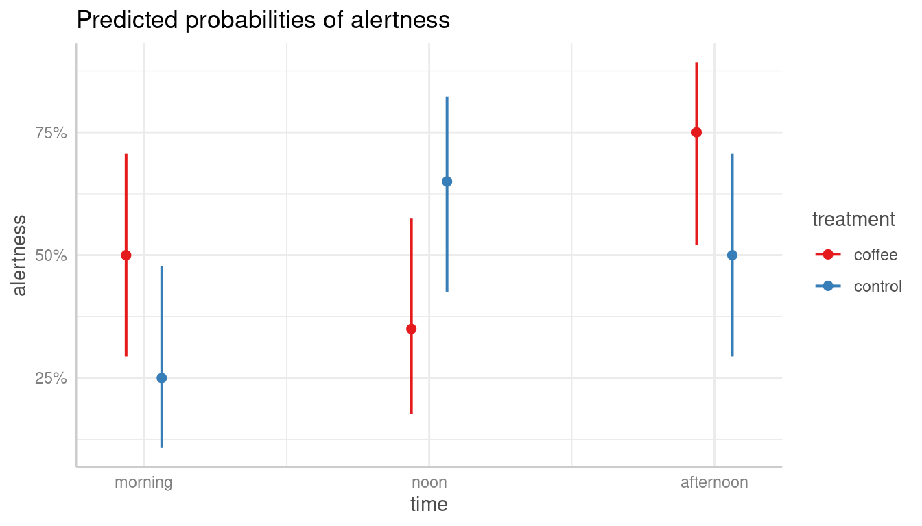 As we can see, the predicted probabilities of alertness are higher for participants who consumed coffee compared to those who did not, but only in the morning and in the afternoon. Furthermore, we see differences between the coffee and the control group at each time point - but are these differences statistically significant?