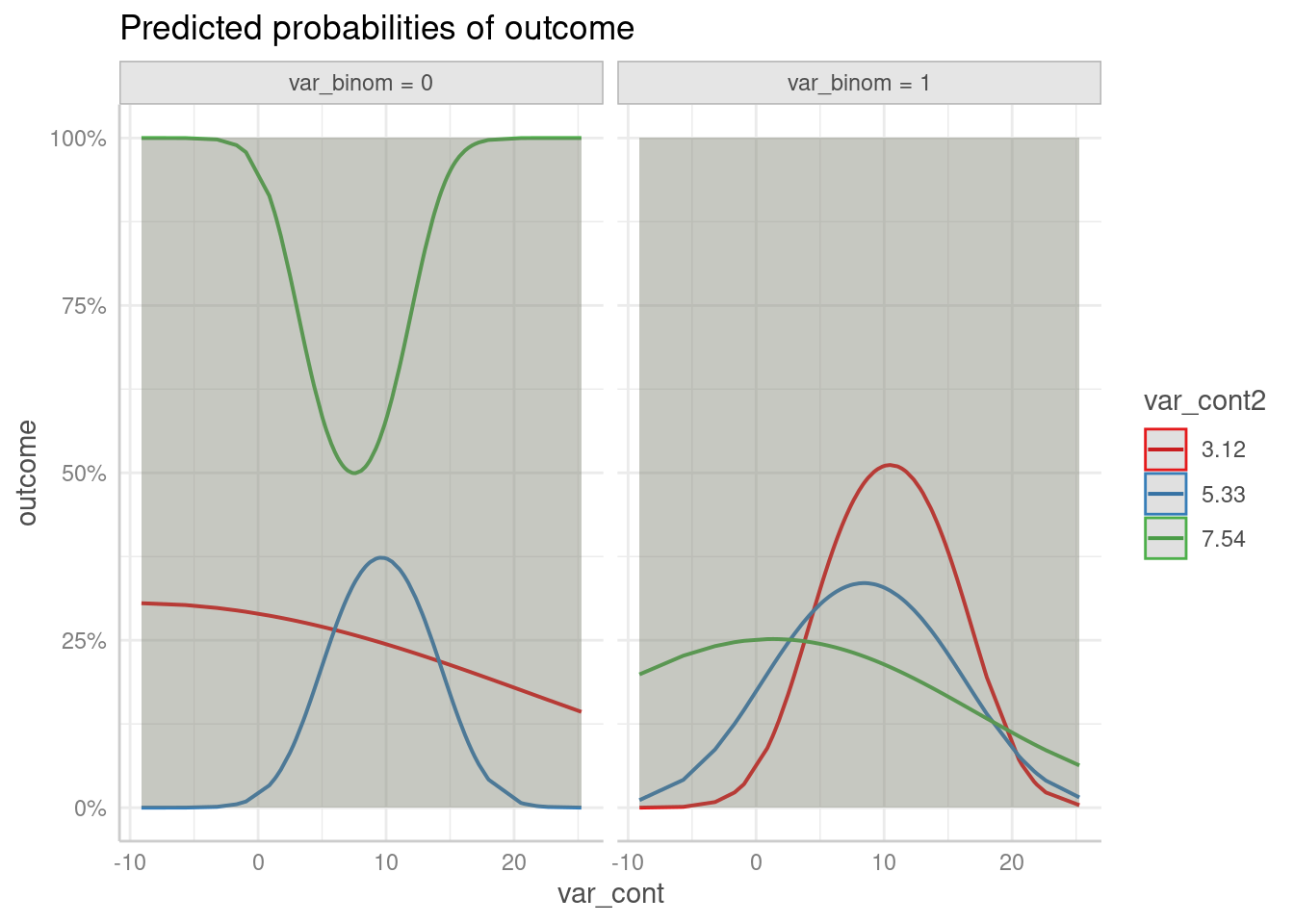 )Since we have adjusted predictions for var_cont at the levels of var_cont2 and var_binom, we not only have groups, but also facets to plot all three “dimensions”. Three-way interactions are plotted simply by speficying all terms in question in the terms-argument.