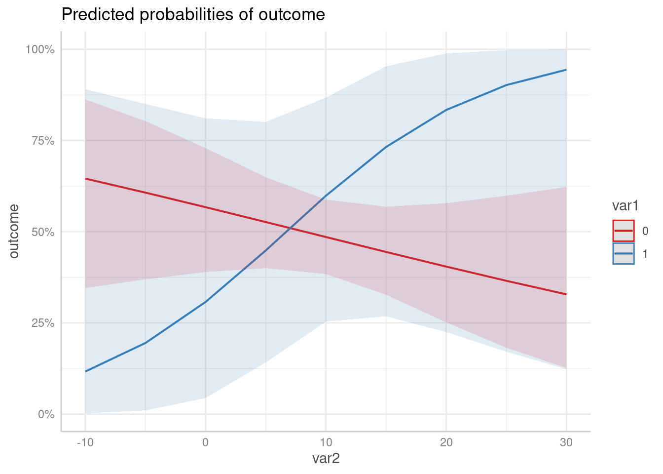 As we can see, the confidence intervals in the Stata plot are outside the plausible range of [0, 1], which means that the predicted uncertainty from the Stata output has a probability higher than 1 and lower than 0, while predict_response() computes confidence intervals within the possible range.