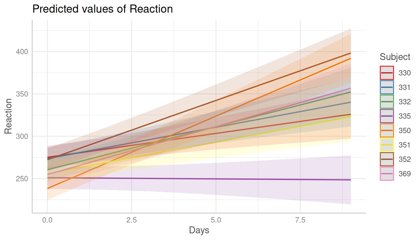 me <- predict_response(m, terms = c("Days", "Subject [sample=8]"), type = "random")