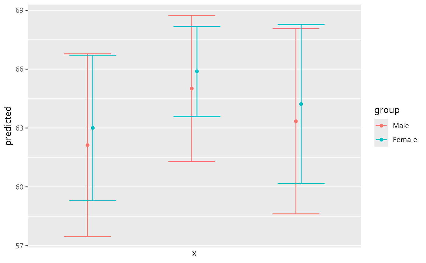termsat least requires one variable name. The maximum length is five terms, where the second to fifth term indicate the groups, i.e. predictions of the first term are grouped at meaningful values or levels of the remaining terms (seevalues_at()). It is also possible to define specific values for focal terms, at which adjusted predictions should be calculated (see details below). All remaining covariates that are not specified intermsare "marginalized", see themarginargument in?predict_response. See also argumentconditionto fix non-focal terms to specific values, and argumenttypicalforggpredict()orggemmeans().- margin