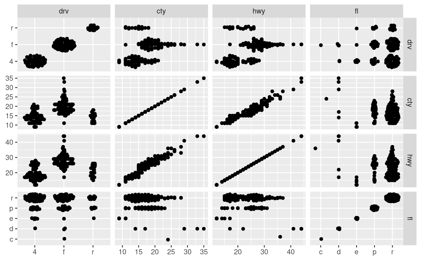 facet_matrix(rows = vars(cty, hwy), cols = vars(drv, fl))