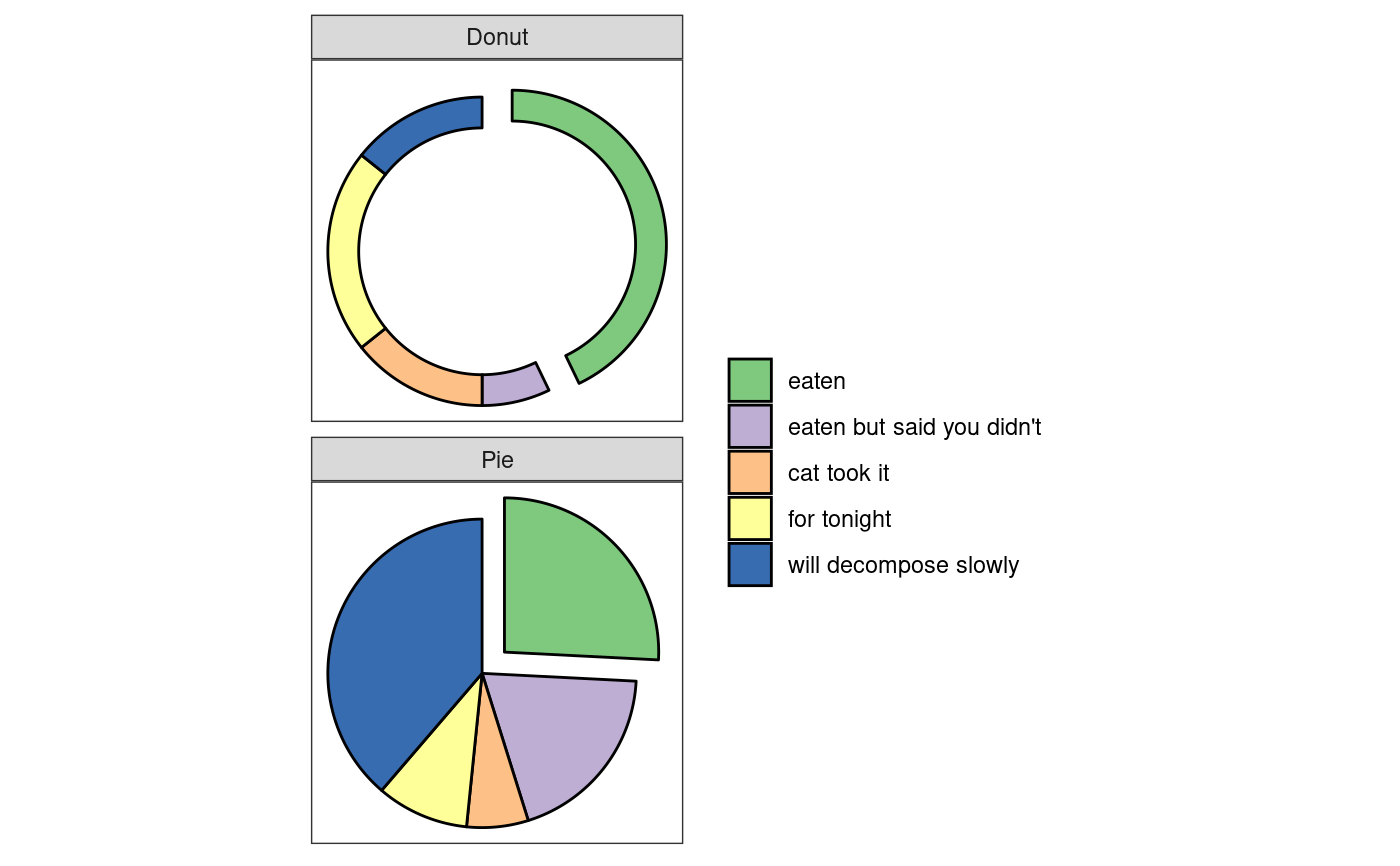 An arc bar is the thick version of an arc; that is, a circle segment drawn as a polygon in the same way as a rectangle is a thick version of a line. A wedge is a special case of an arc where the inner radius is 0. As opposed to applying coord_polar to a stacked bar chart, these layers are drawn in cartesian space, which allows for transformations not possible with the native ggplot2 approach. Most notable of these are the option to explode arcs and wedgets away from their center point, thus detaching it from the main pie/donut.