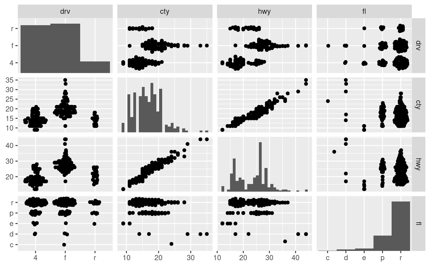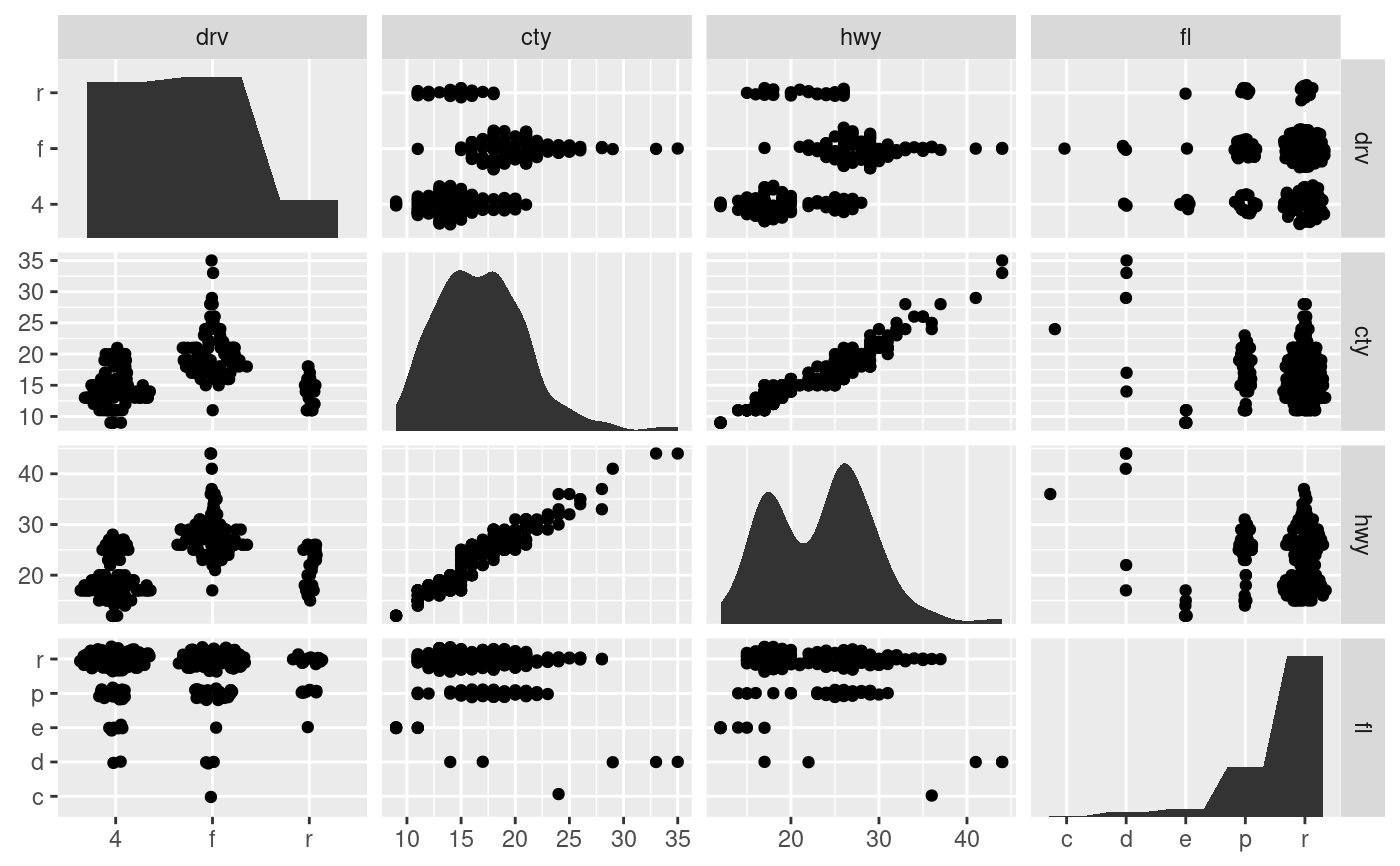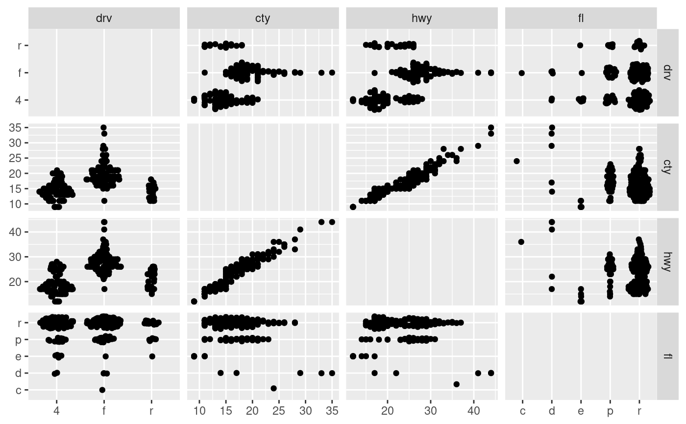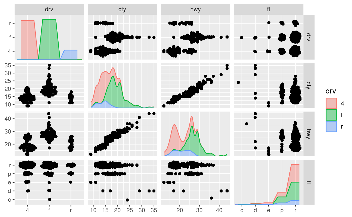 facet_matrix(vars(drv:fl), layer.diag = 2, grid.y.diag = FALSE)