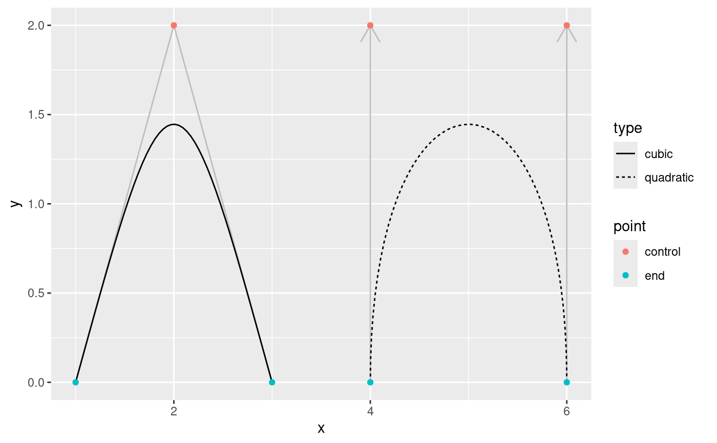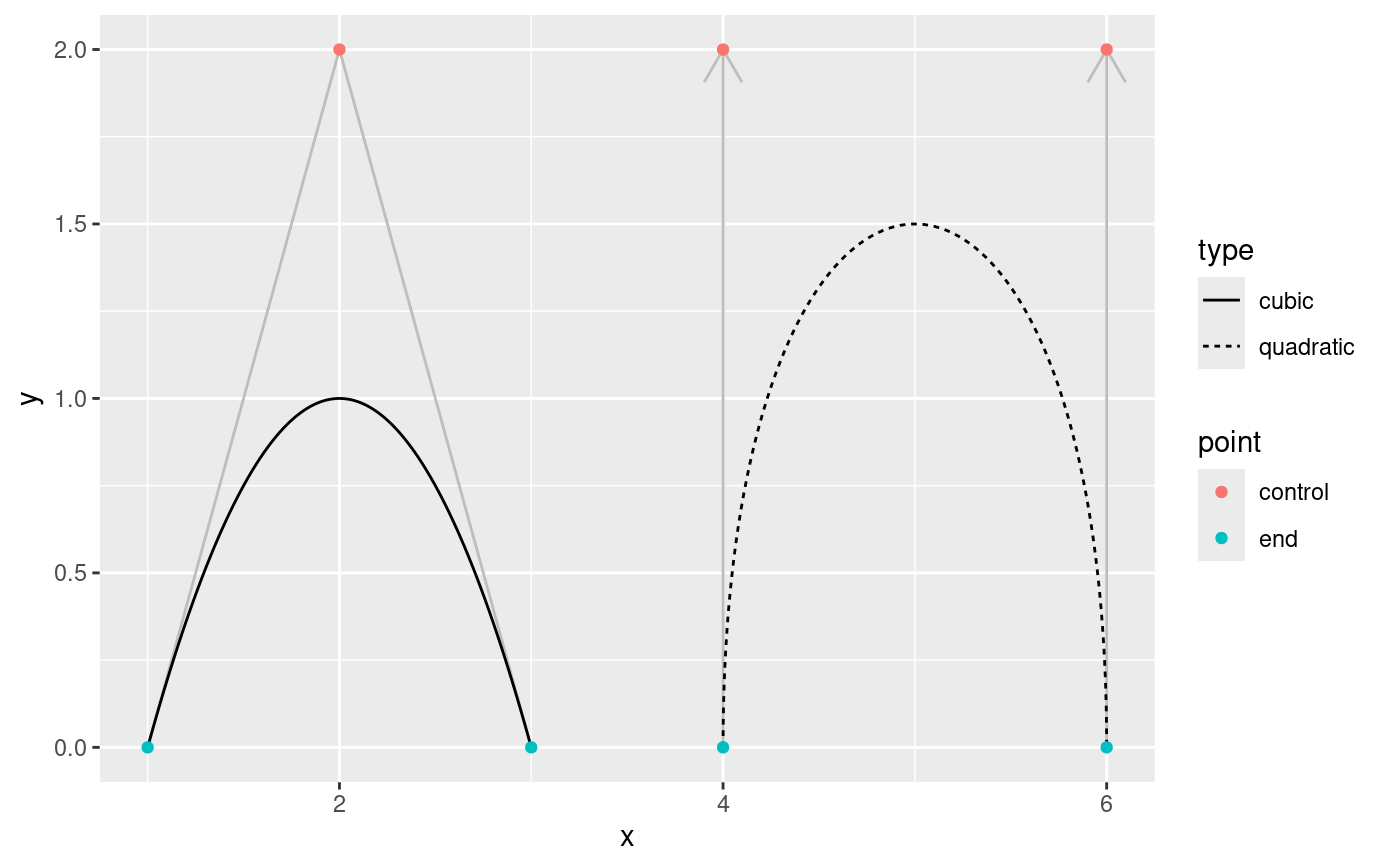 point, while geom_bezier2 interpolates the aesthetics between the start and
