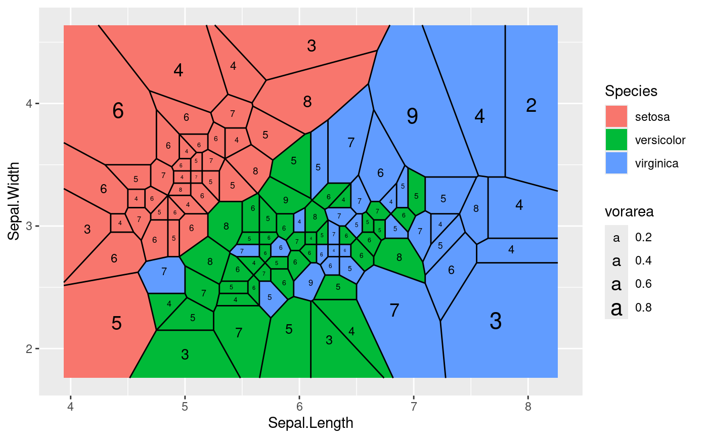 geom_text(aes(label = after_stat(nsides), size = after_stat(vorarea)),