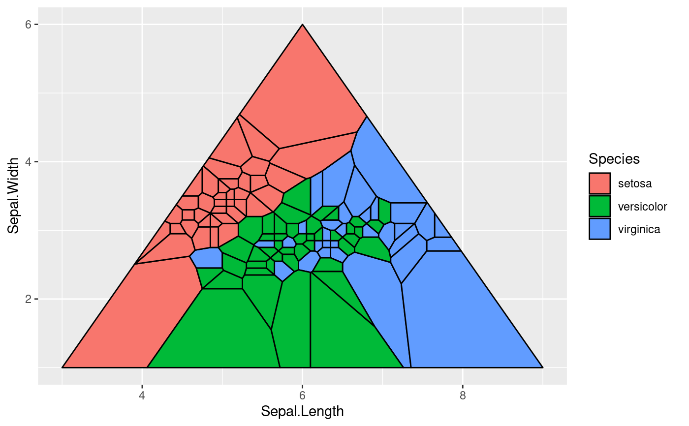geom_voronoi_tile(aes(fill = Species), colour = 'black', bound = triangle)