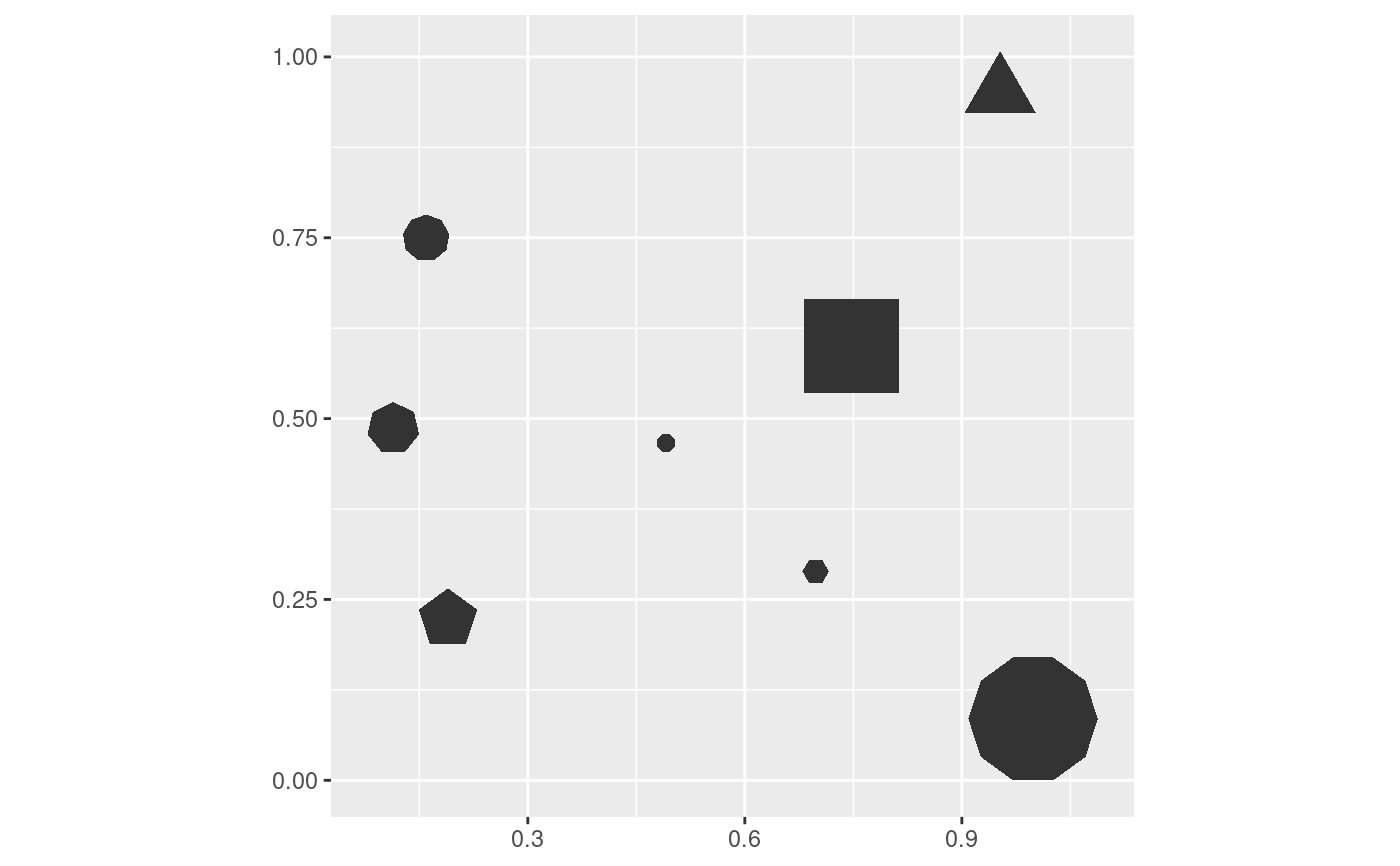 This geom makes it easy to construct regular polygons (polygons where all sides and angles are equal) by specifying the number of sides, position, and size. The polygons are always rotated so that they "rest" on a flat side, but this can be changed with the angle aesthetic. The size is based on the radius of their circumcircle and is thus not proportional to their area.