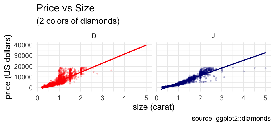 gf_point(price ~ carat, data = diamonds2, color = ~ col, alpha = 0.2, size = 0.5) %>% gf_lm(alpha = 0.5) %>% gf_facet_wrap( ~ color) %>% gf_labs(title = "Price vs Size", subtitle = "(2 colors of diamonds)", caption = "source: ggplot2::diamonds", x = "size (carat)", y = "price (US dollars)" ) %>% gf_refine(scale_color_manual(values = c("red", "navy"), guide = "none")) %>% gf_theme(theme_minimal())