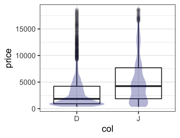 gf_boxplot(price ~ col, data = diamonds2) gf_violin(price ~ col, data = diamonds2)