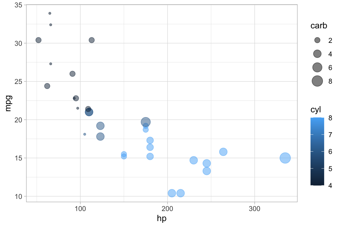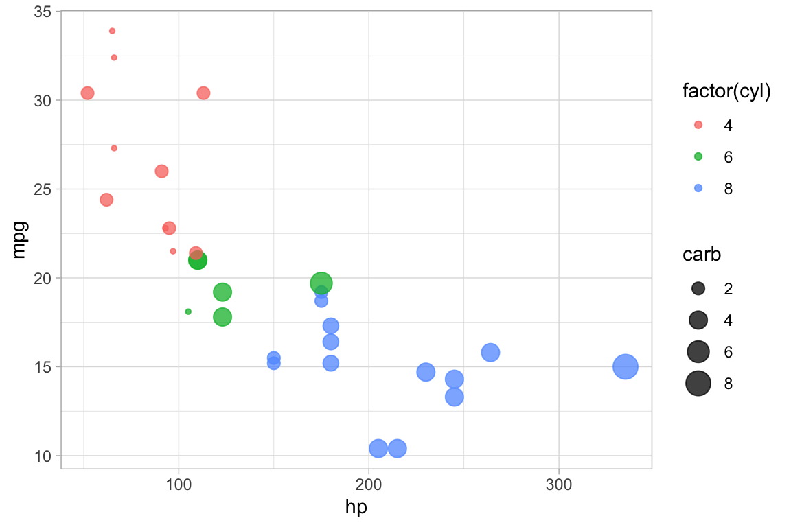 gf_point(mpg ~ hp, color = ~cyl, size = ~carb, alpha = 0.50, data = mtcars)