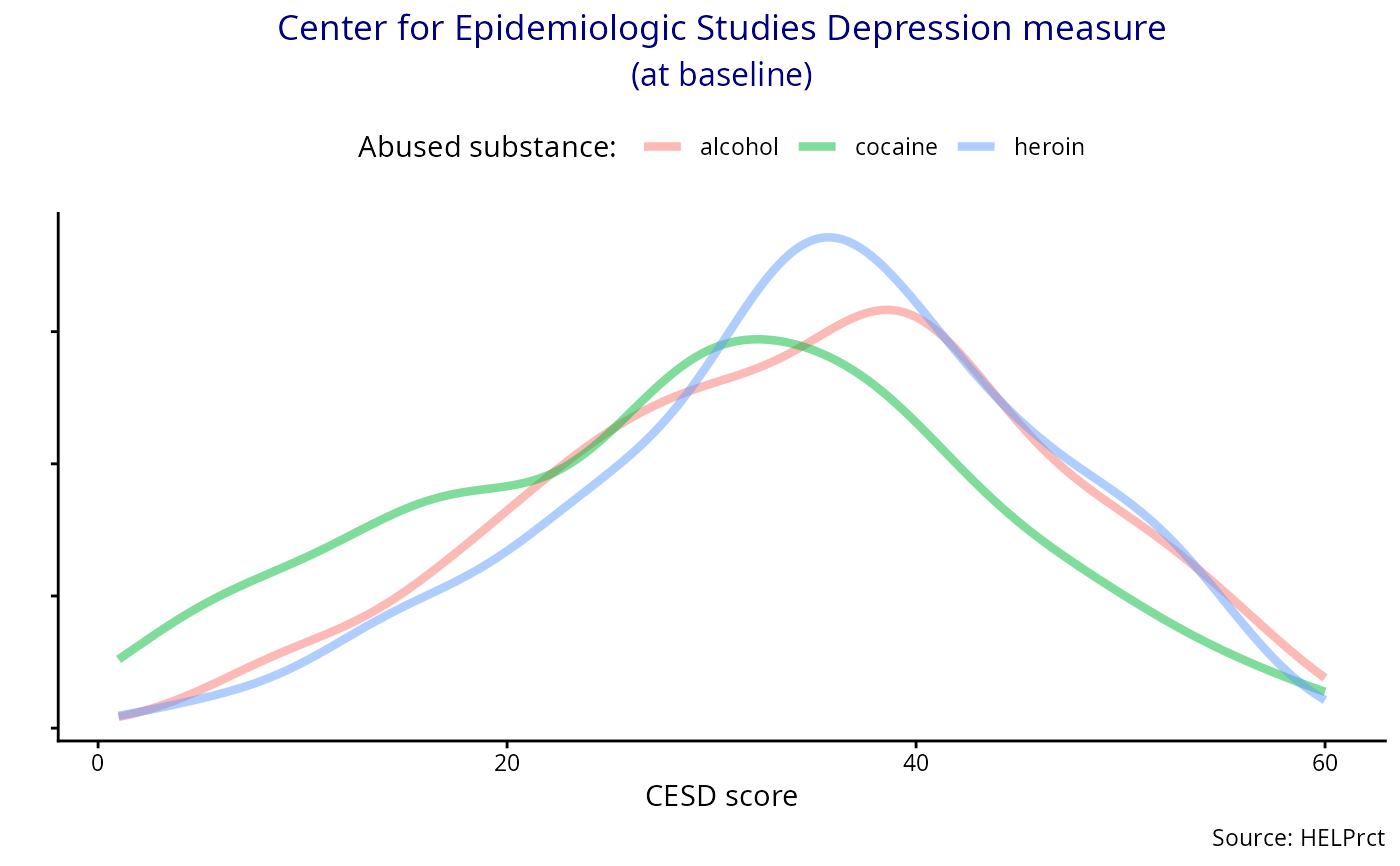 gf_dens(~cesd, color = ~substance, linewidth = 1.5, data = mosaicData::HELPrct) |>