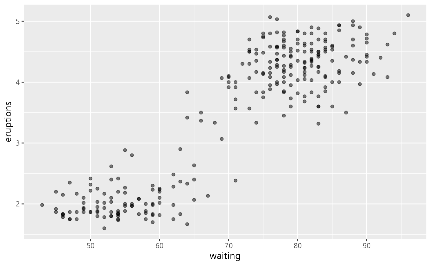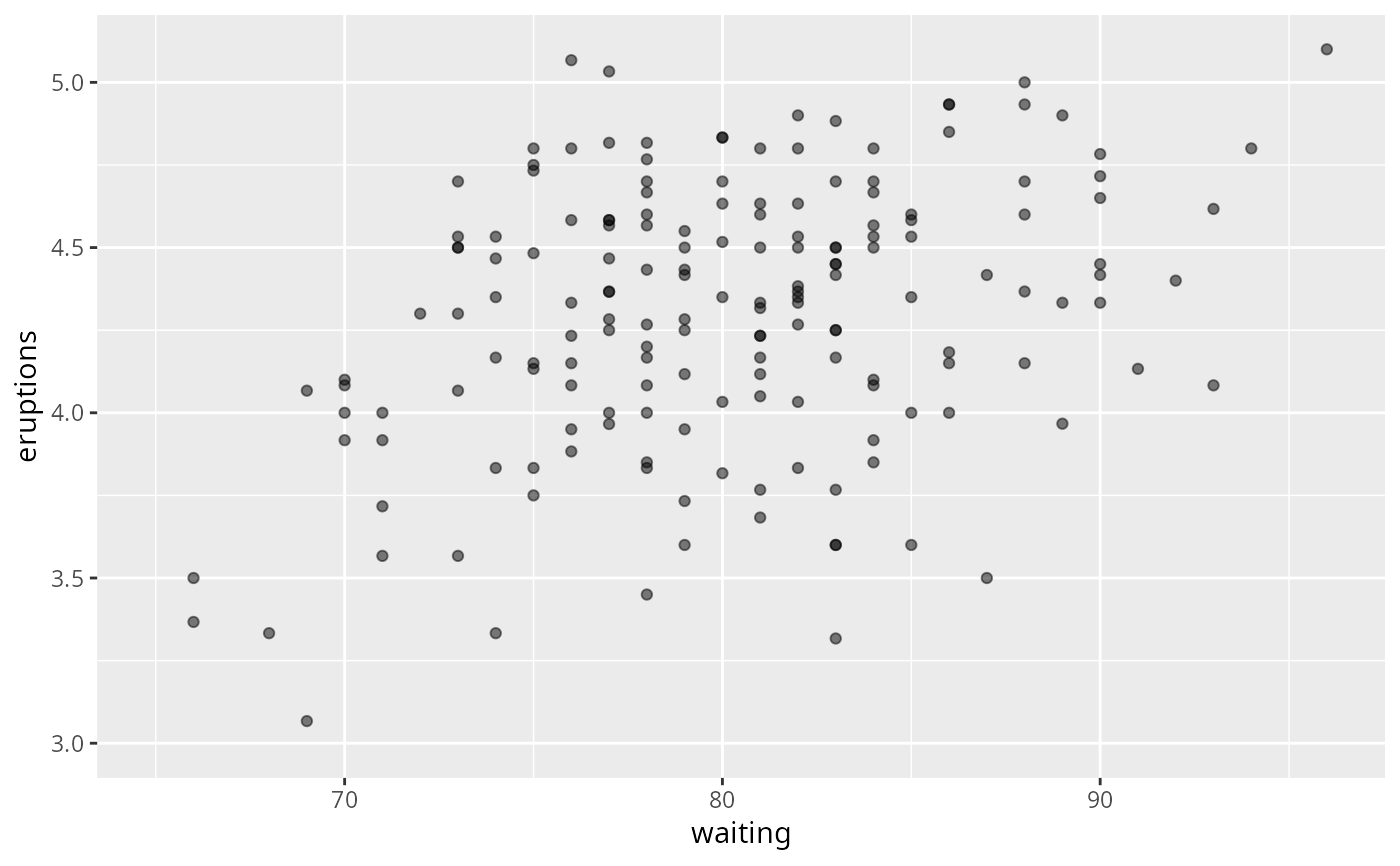 gf_point(eruptions ~ waiting, data = faithful, alpha = 0.5) |>