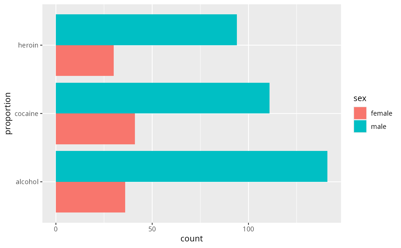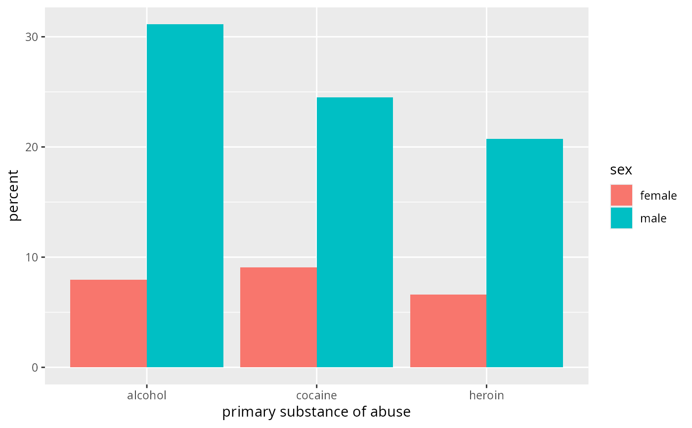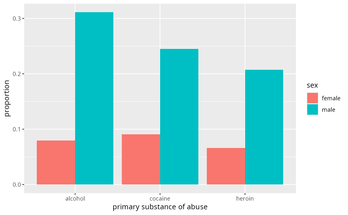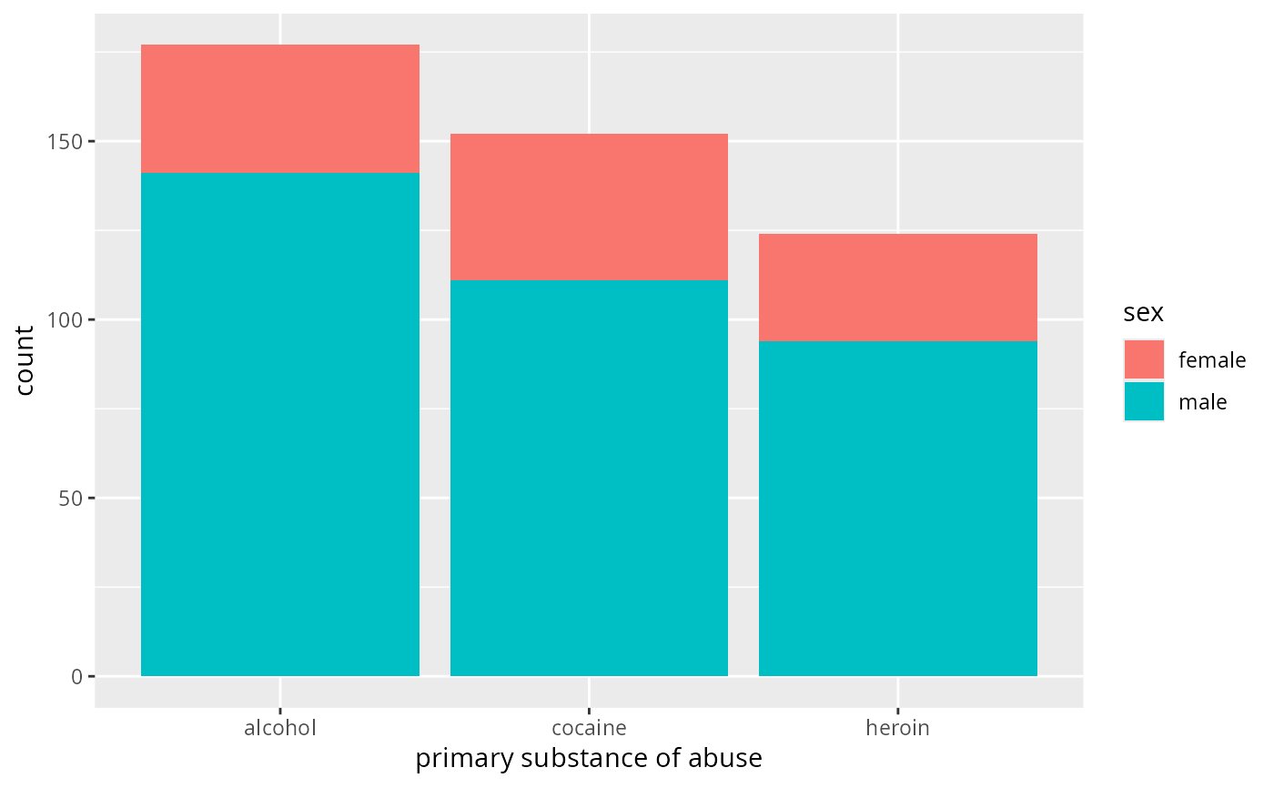 gf_bar(~substance, data = mosaicData::HELPrct, fill = ~sex)