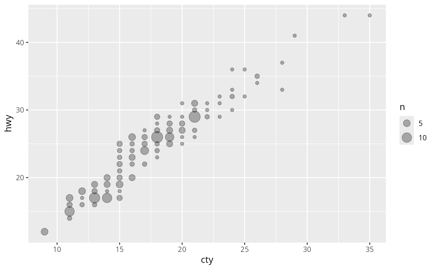 gf_count(hwy ~ cty, data = mpg, alpha = 0.3) |>