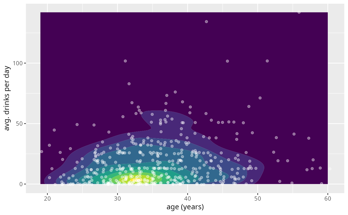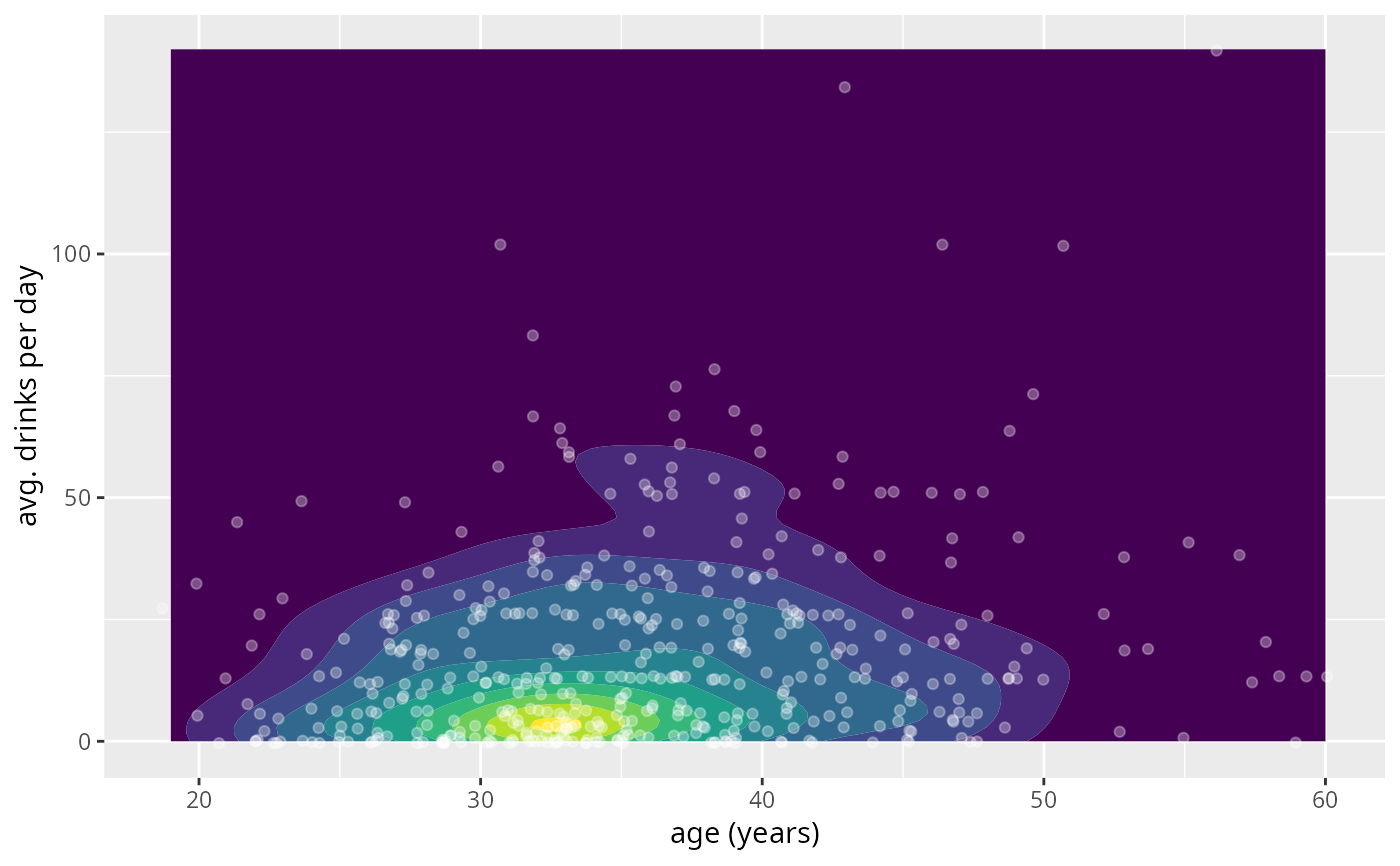 gf_density_2d_filled(avg_drinks ~ age, data = mosaicData::HELPrct, show.legend = FALSE) |>