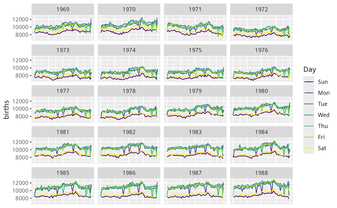 gf_line(births ~ date, data = mosaicData::Births, color = ~wday) |>