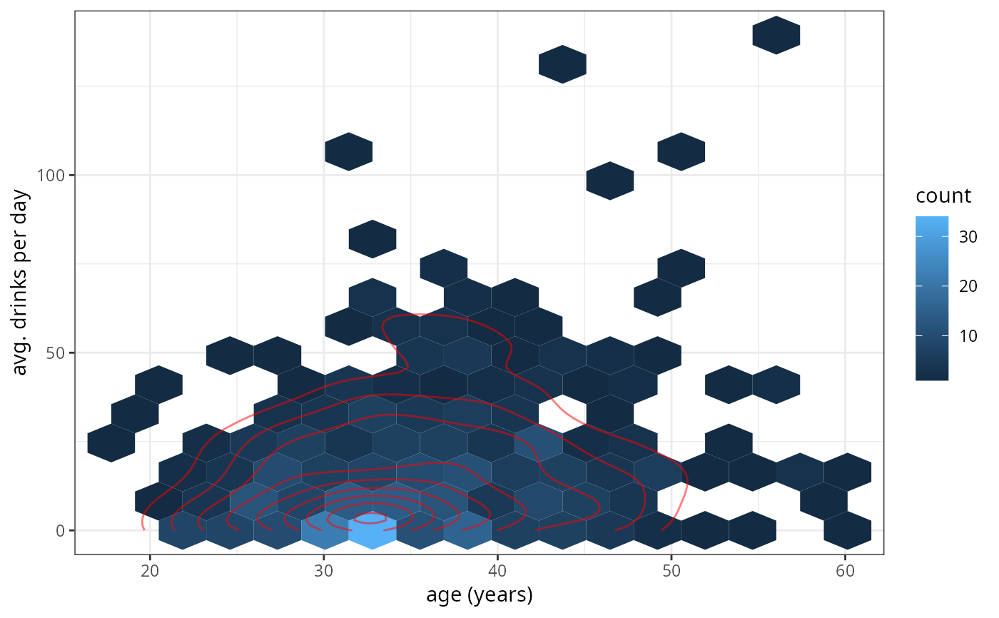 gf_hex(avg_drinks ~ age, data = mosaicData::HELPrct, bins = 15) |>