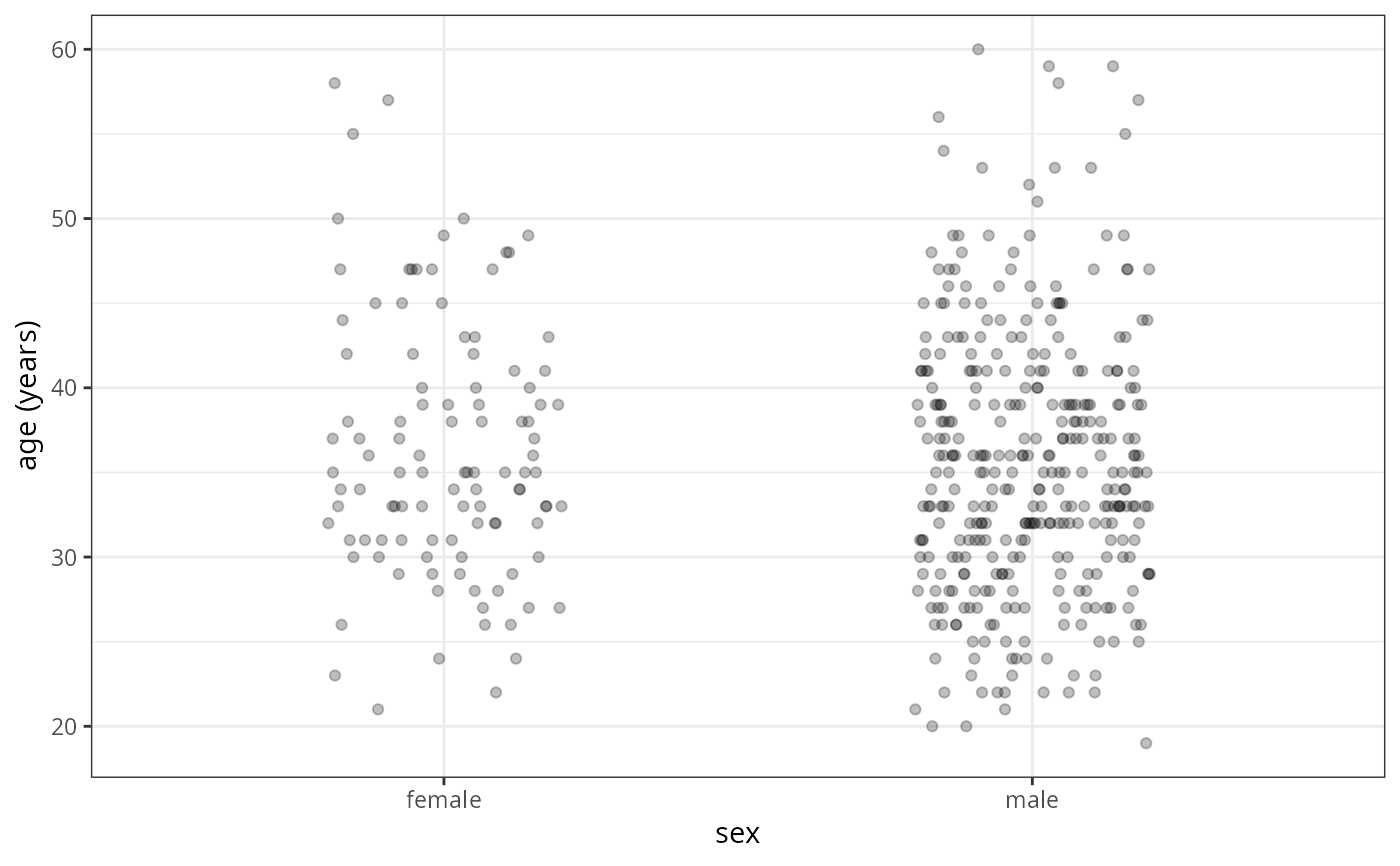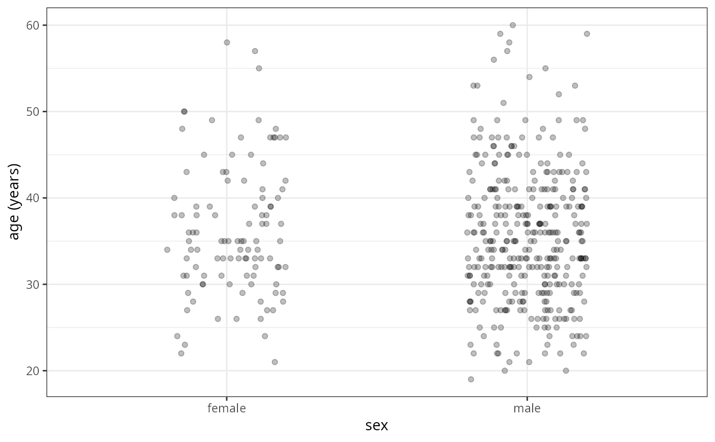 gf_jitter(age ~ sex, alpha = 0.25, data = mosaicData::HELPrct, width = 0.2, height = 0)