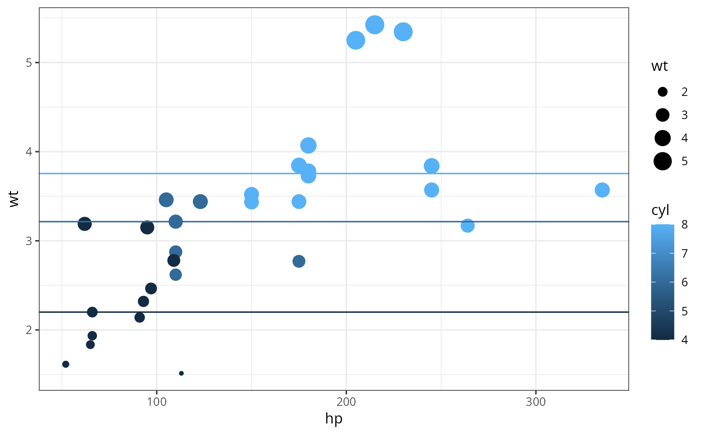 gf_point(wt ~ hp, size = ~wt, color = ~cyl, data = mtcars) |>
