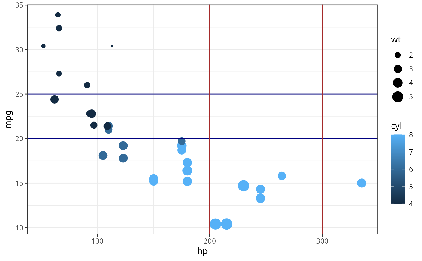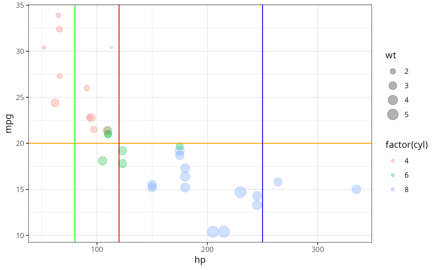 gf_vline(color = c("green", "red", "blue"), xintercept = ~ c(80, 120, 250),