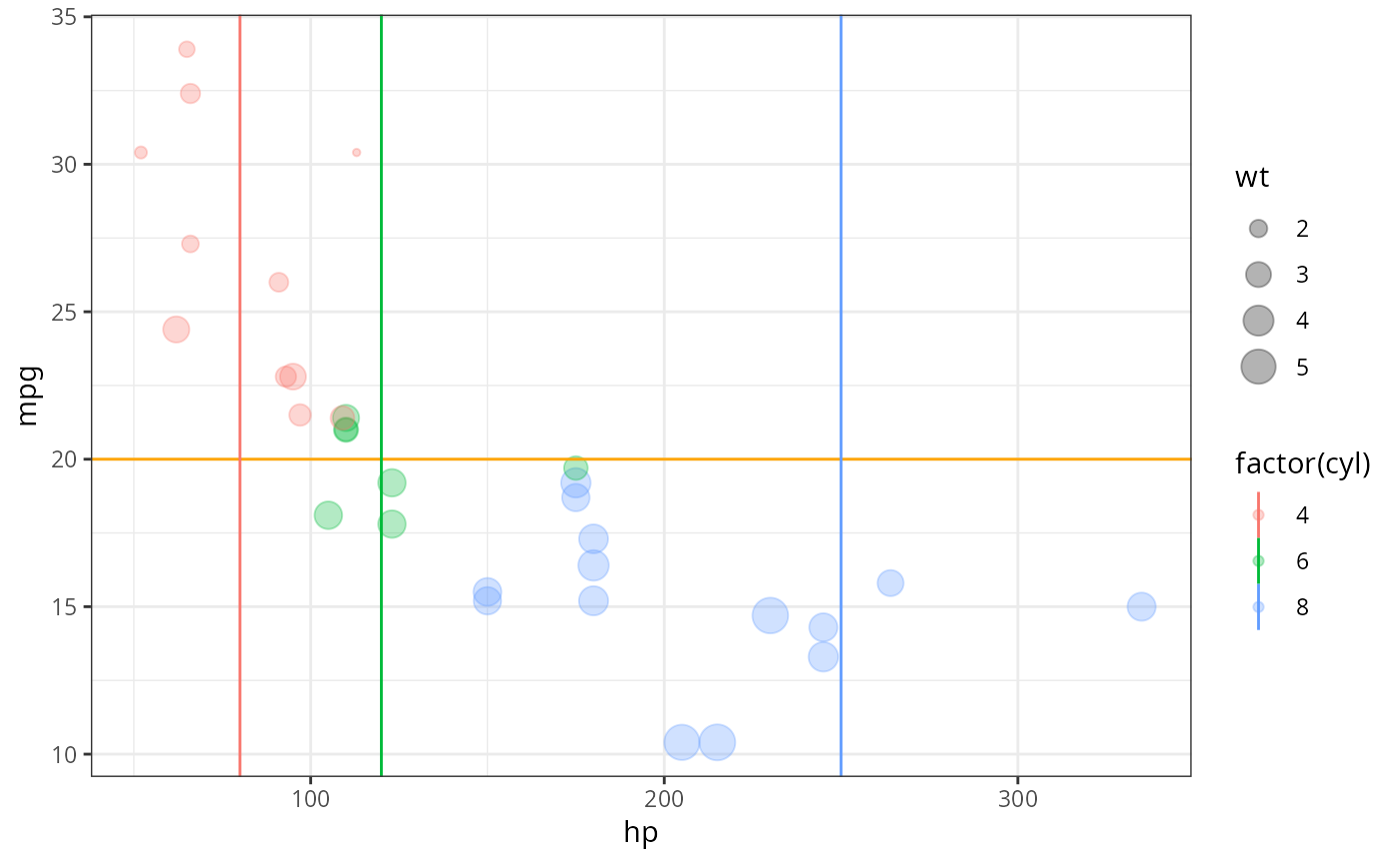 gf_point(mpg ~ hp, size = ~wt, color = ~ factor(cyl), data = mtcars, alpha = 0.3) |>