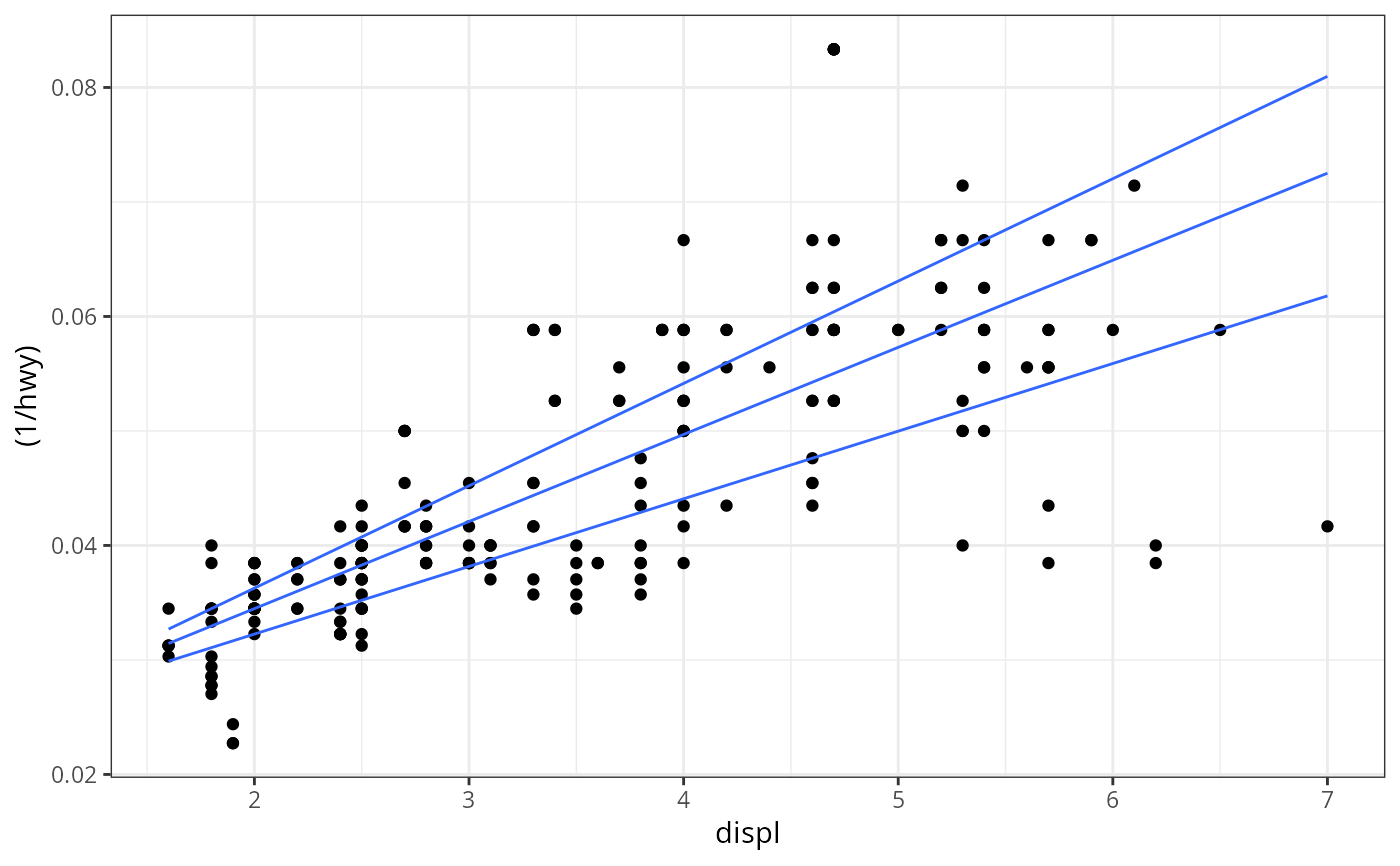 gf_point((1 / hwy) ~ displ, data = mpg) |>