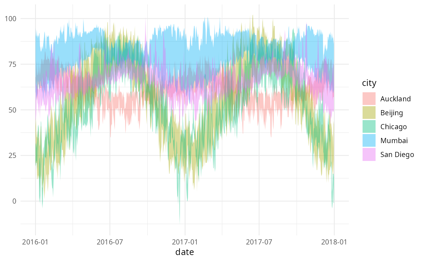 gf_ribbon(low_temp + high_temp ~ date, data = mosaicData::Weather, fill = ~city, alpha = 0.4) |>
