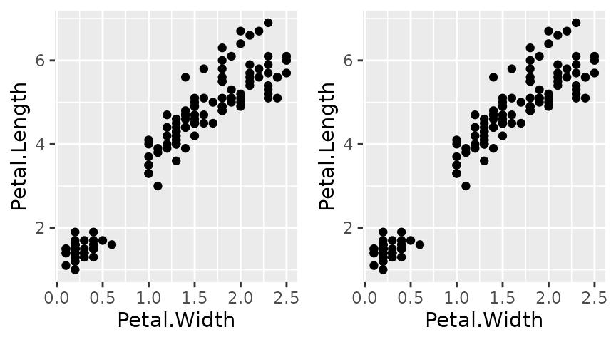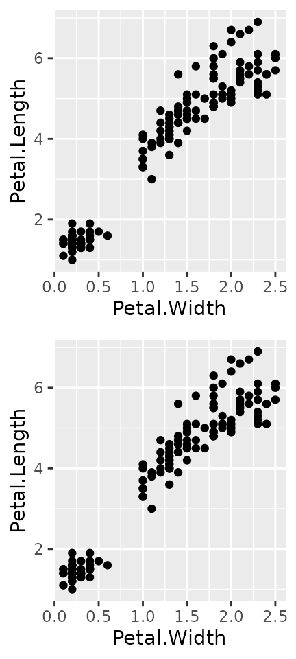 p2 <- ggplot(iris, aes(Petal.Width, Petal.Length)) + geom_point()